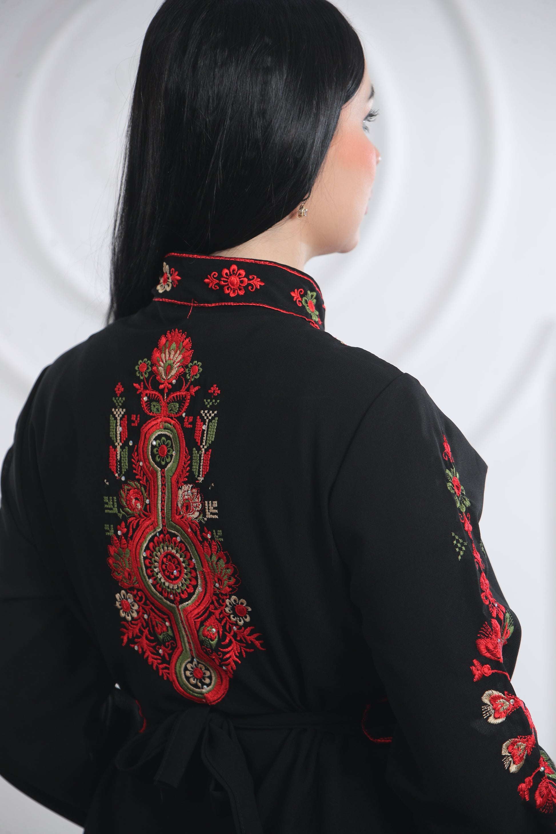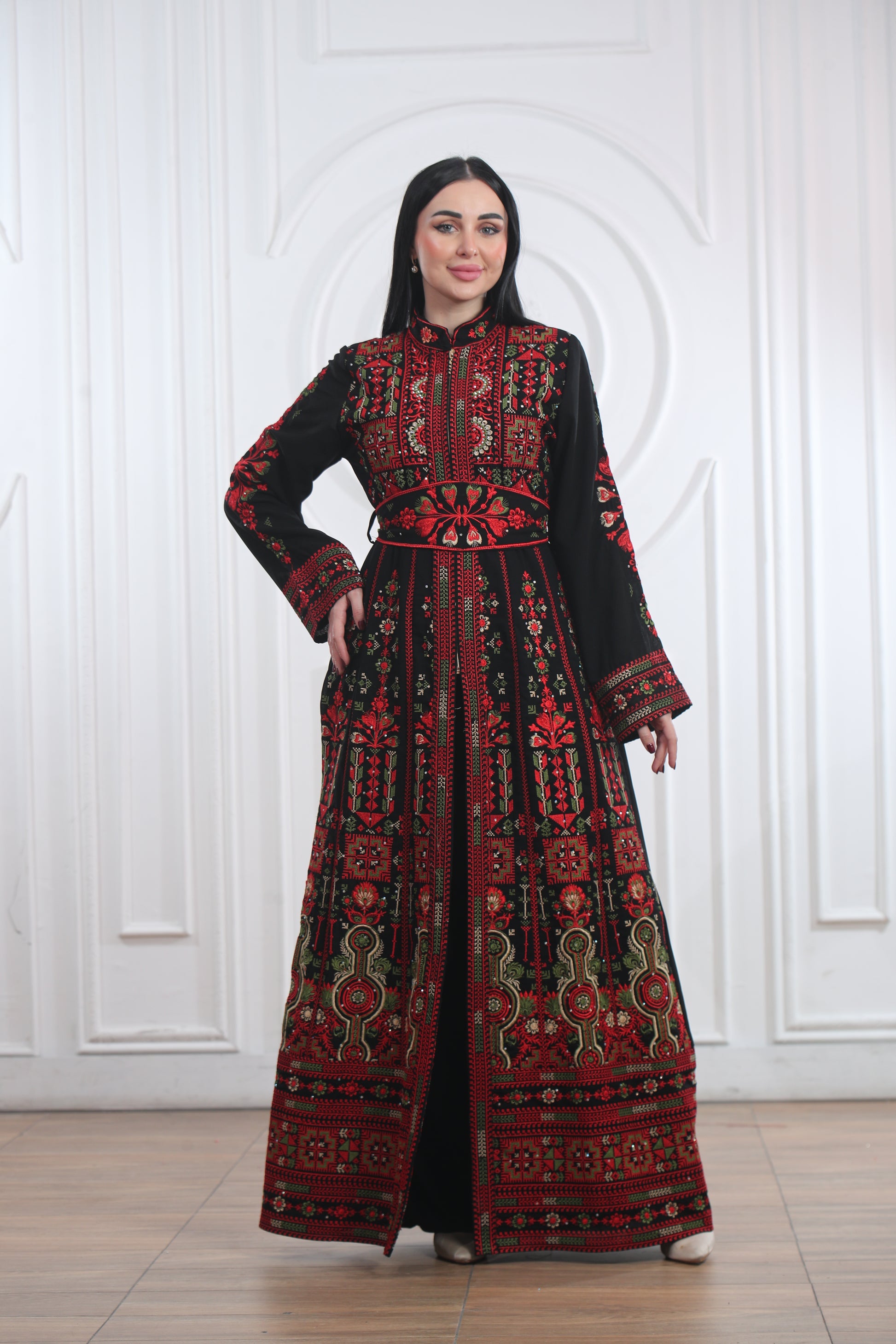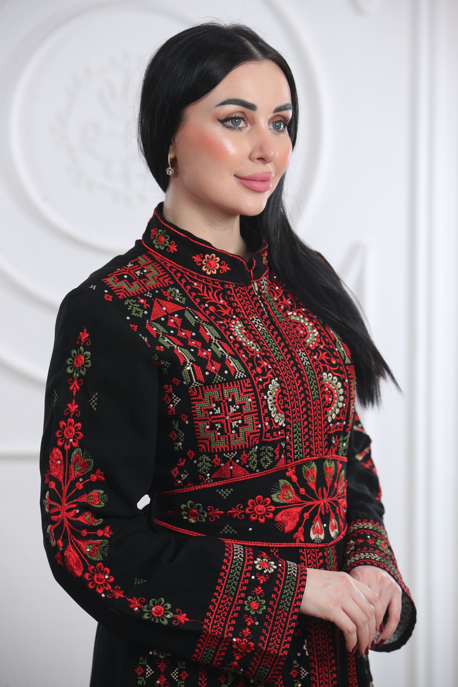 This beautifully embroidered black thobe features intricate red and green threadwork that adds depth and elegance to the full design. It has a structured collar and wide sleeves, offering both comfort and style. The matching waist tie brings the look together while keeping a modest and traditional fit. Made from high-quality fabric, this thobe combines detailed embroidery with a smooth, graceful flow—perfect for special occasions or formal gatherings.