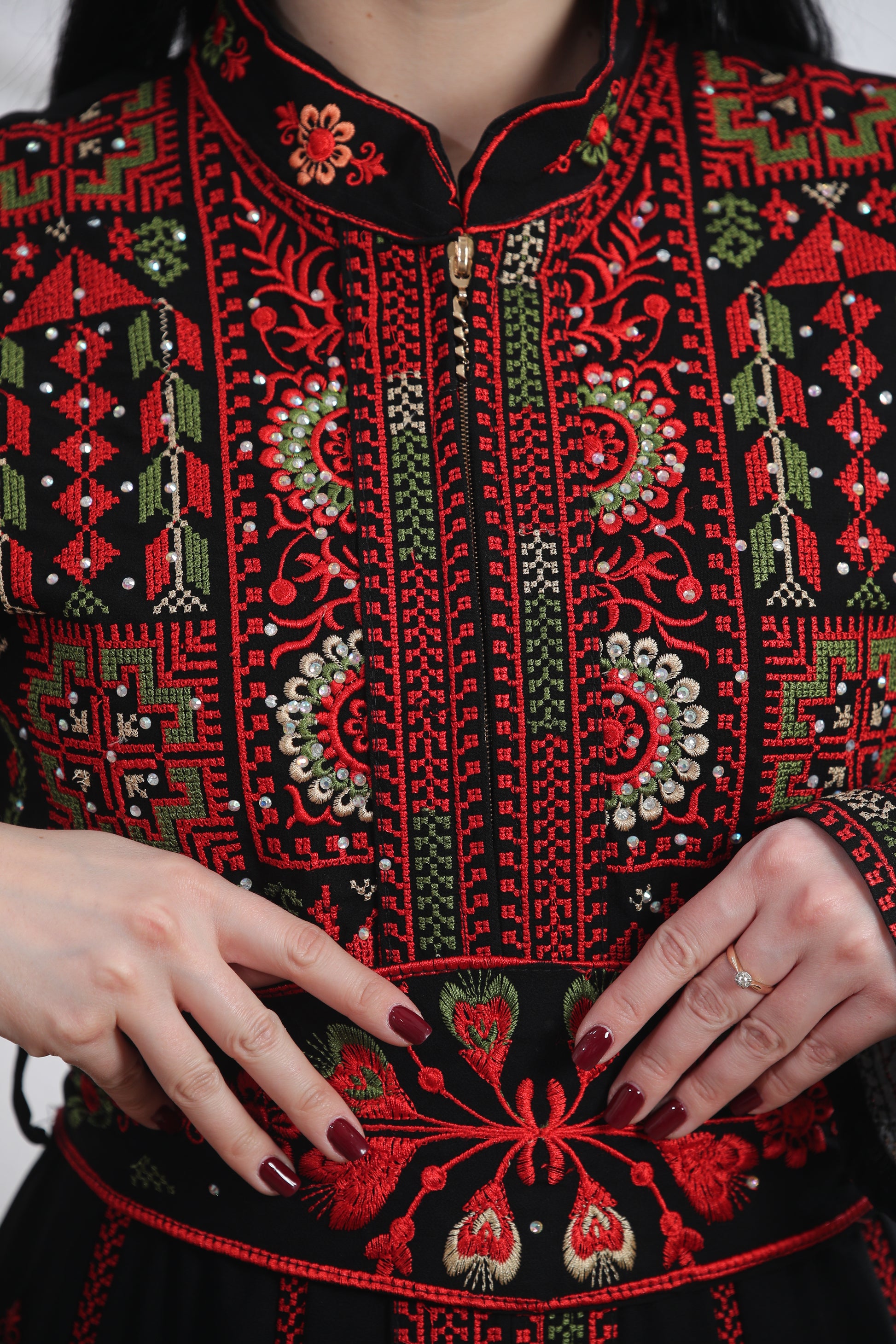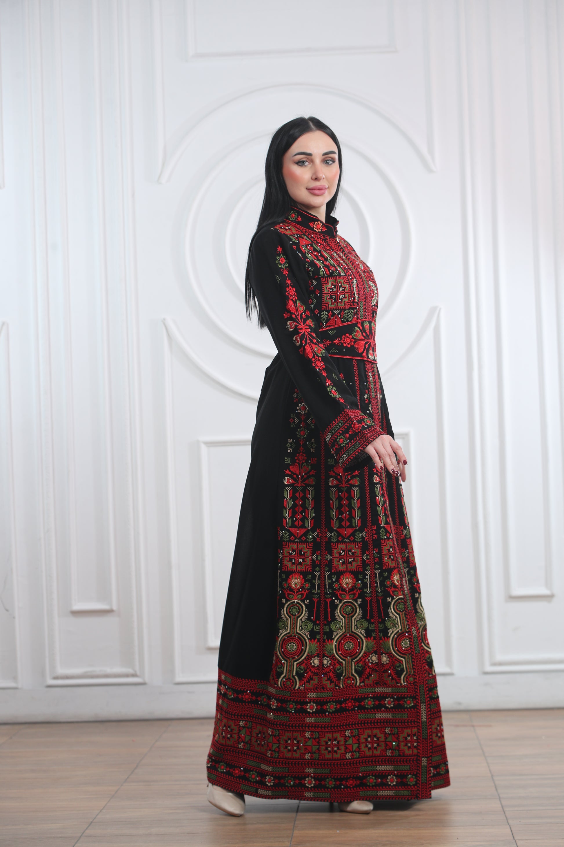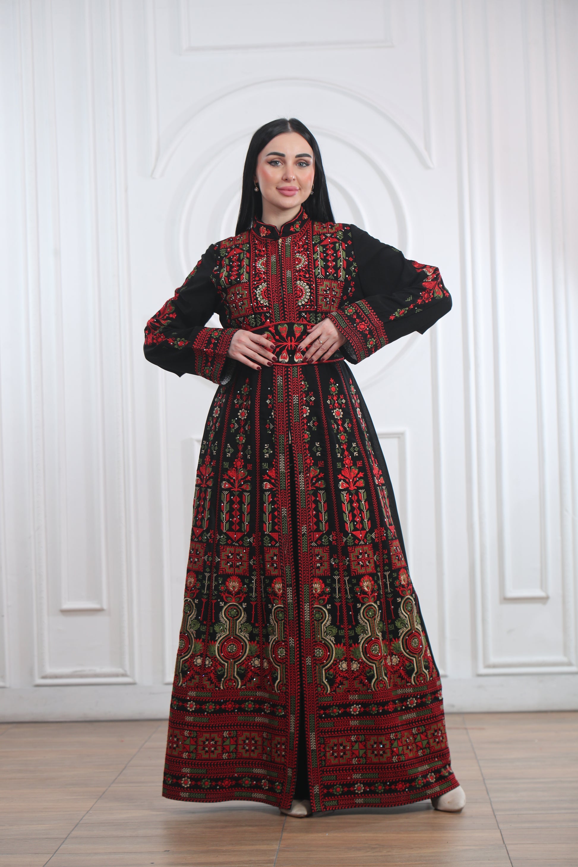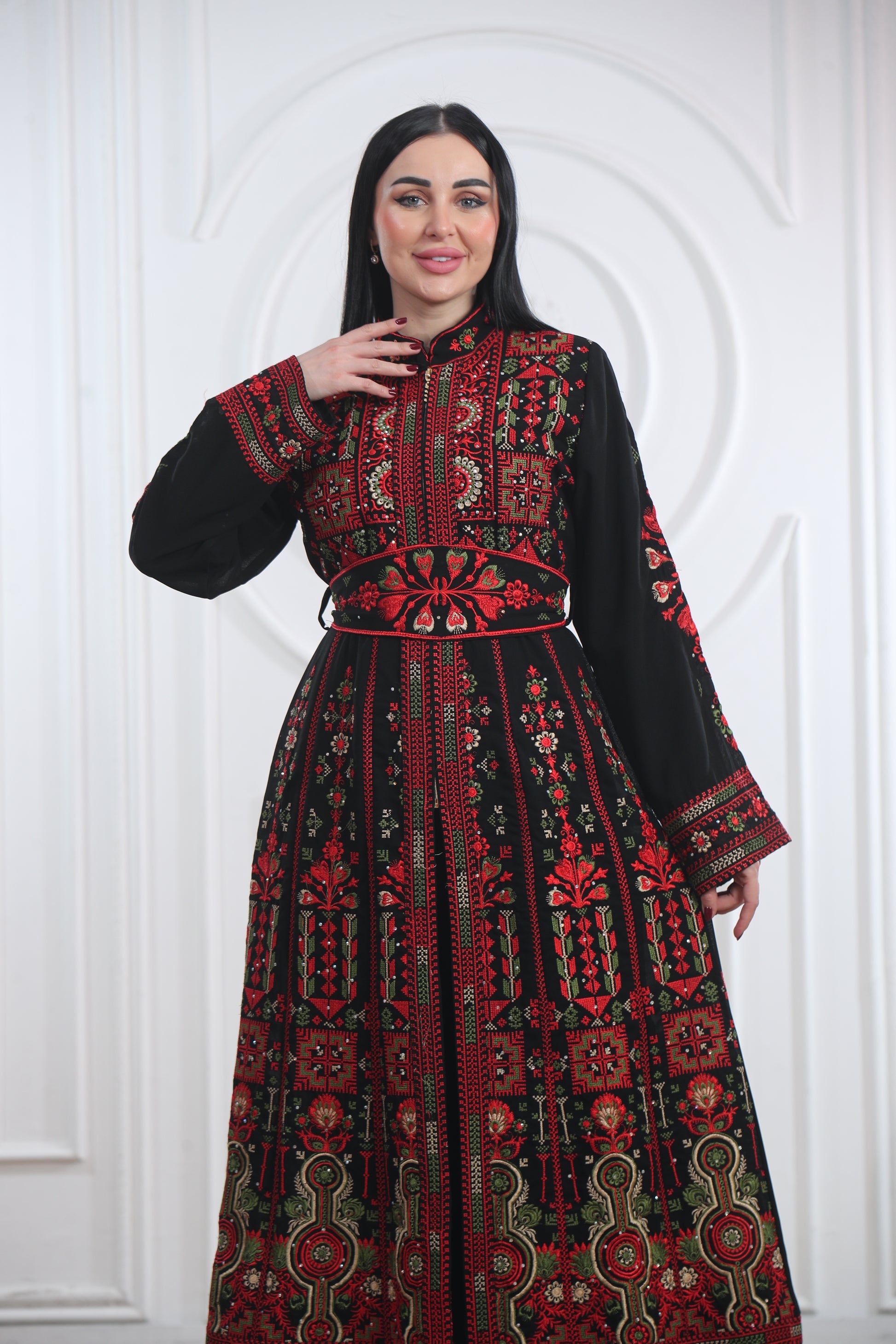 This beautifully embroidered black thobe features intricate red and green threadwork that adds depth and elegance to the full design. It has a structured collar and wide sleeves, offering both comfort and style. The matching waist tie brings the look together while keeping a modest and traditional fit. Made from high-quality fabric, this thobe combines detailed embroidery with a smooth, graceful flow—perfect for special occasions or formal gatherings.