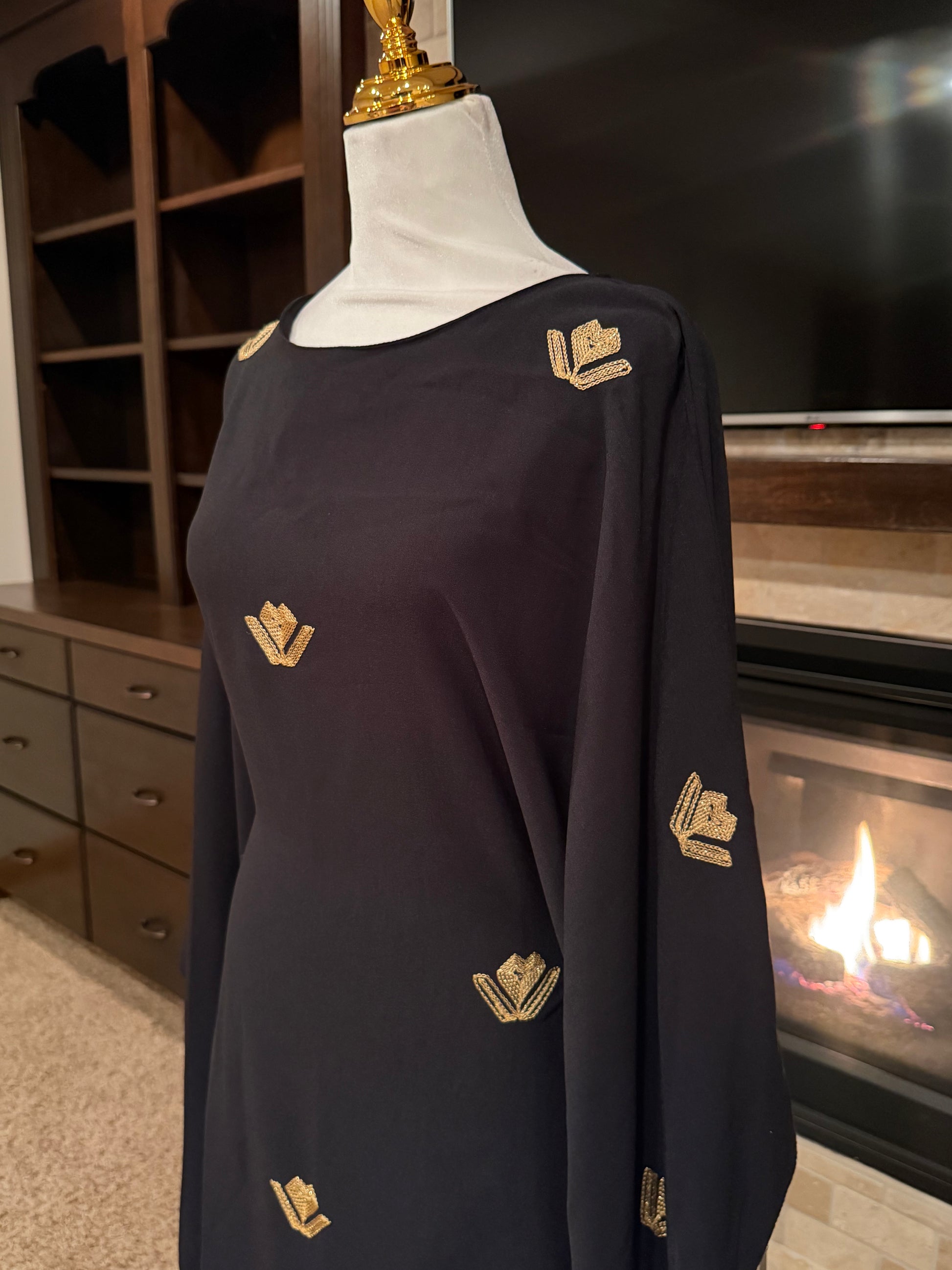 The Golden Bloom Butterfly Abaya is a one-size elegant abaya made with soft flowing fabric that gives a relaxed and graceful look. It features gold embroidery on the front and along the bottom for a stylish touch. The abaya includes an inner belt that can be tied to adjust the fit. Perfect for special occasions, family gatherings, or evening events, this abaya is both comfortable and classy.