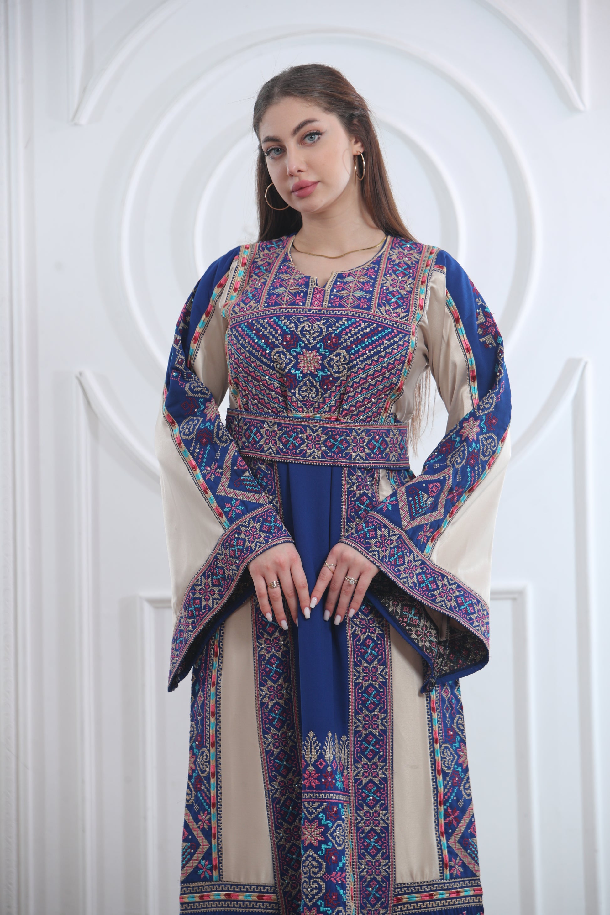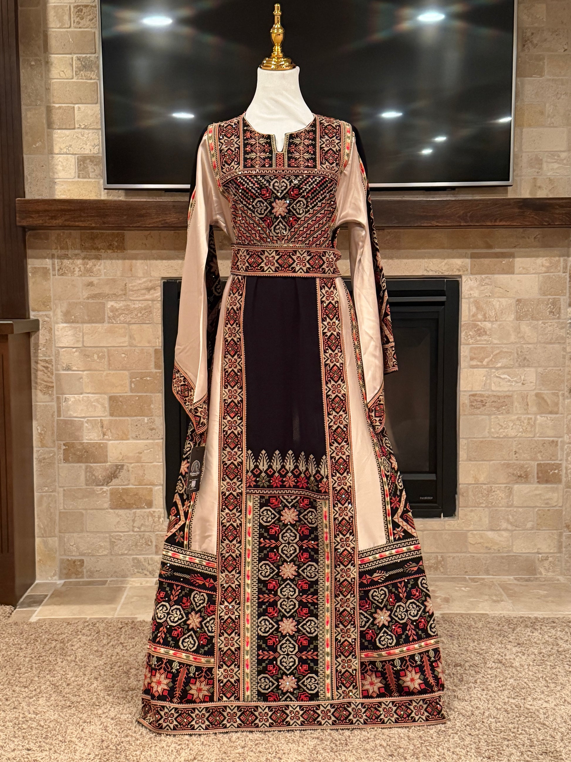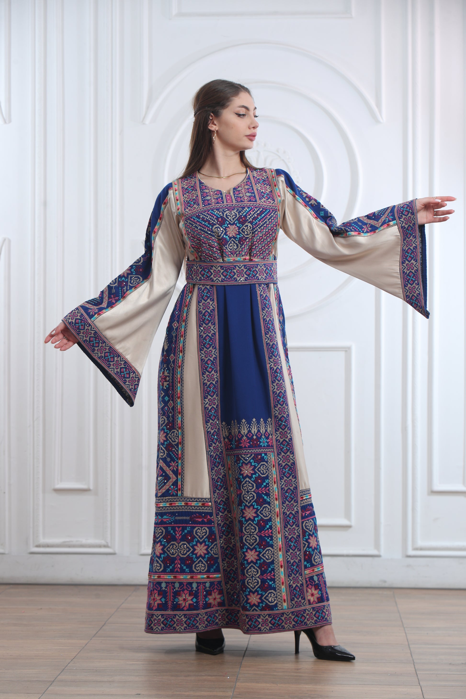 The Al Qamar Thobe blends elegance with traditional artistry. Its intricate embroidery flows across the front, sleeves, and hem, creating a refined and eye-catching design. The soft satin panels add a gentle shine, while the wide draped sleeves give it a graceful, timeless charm.