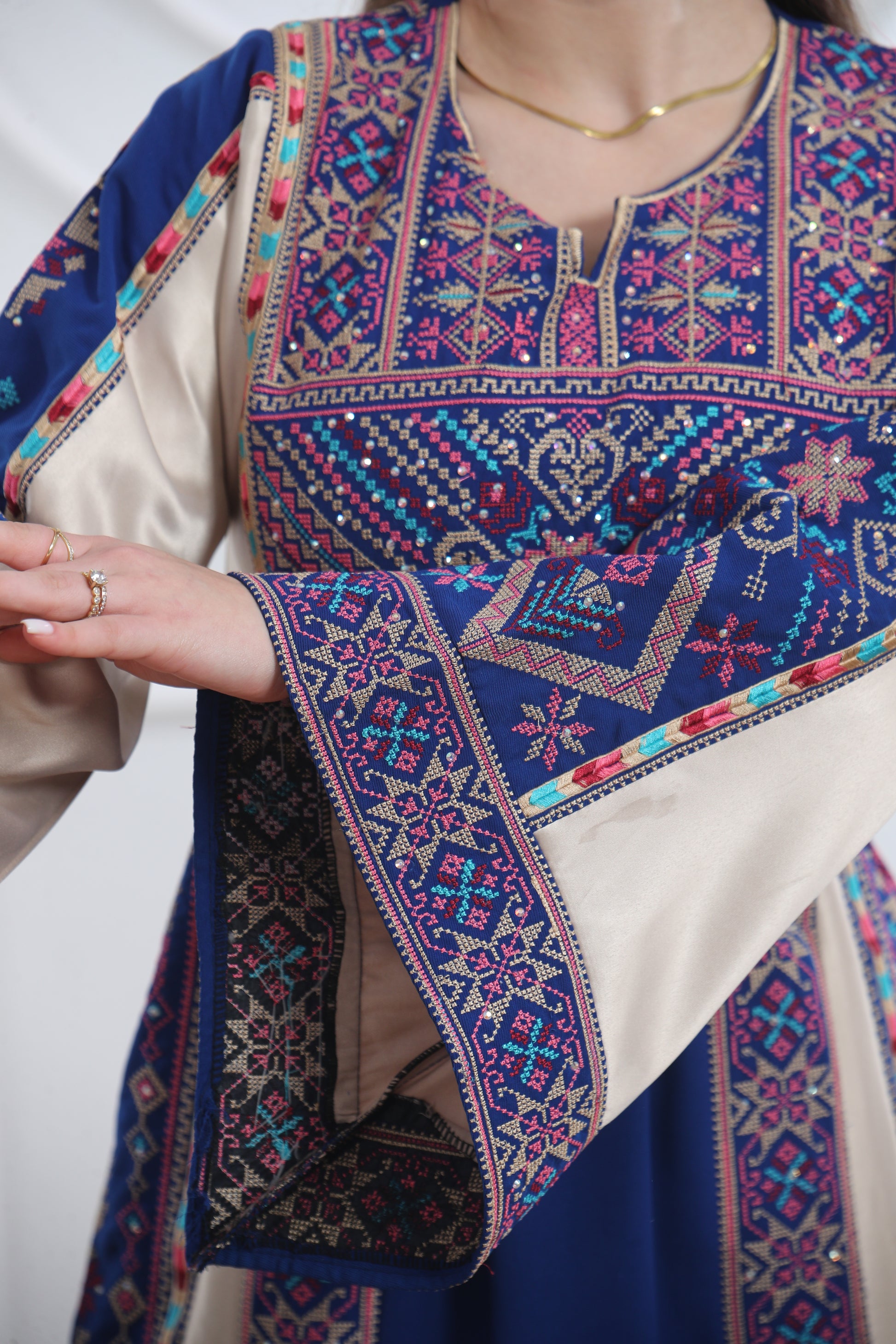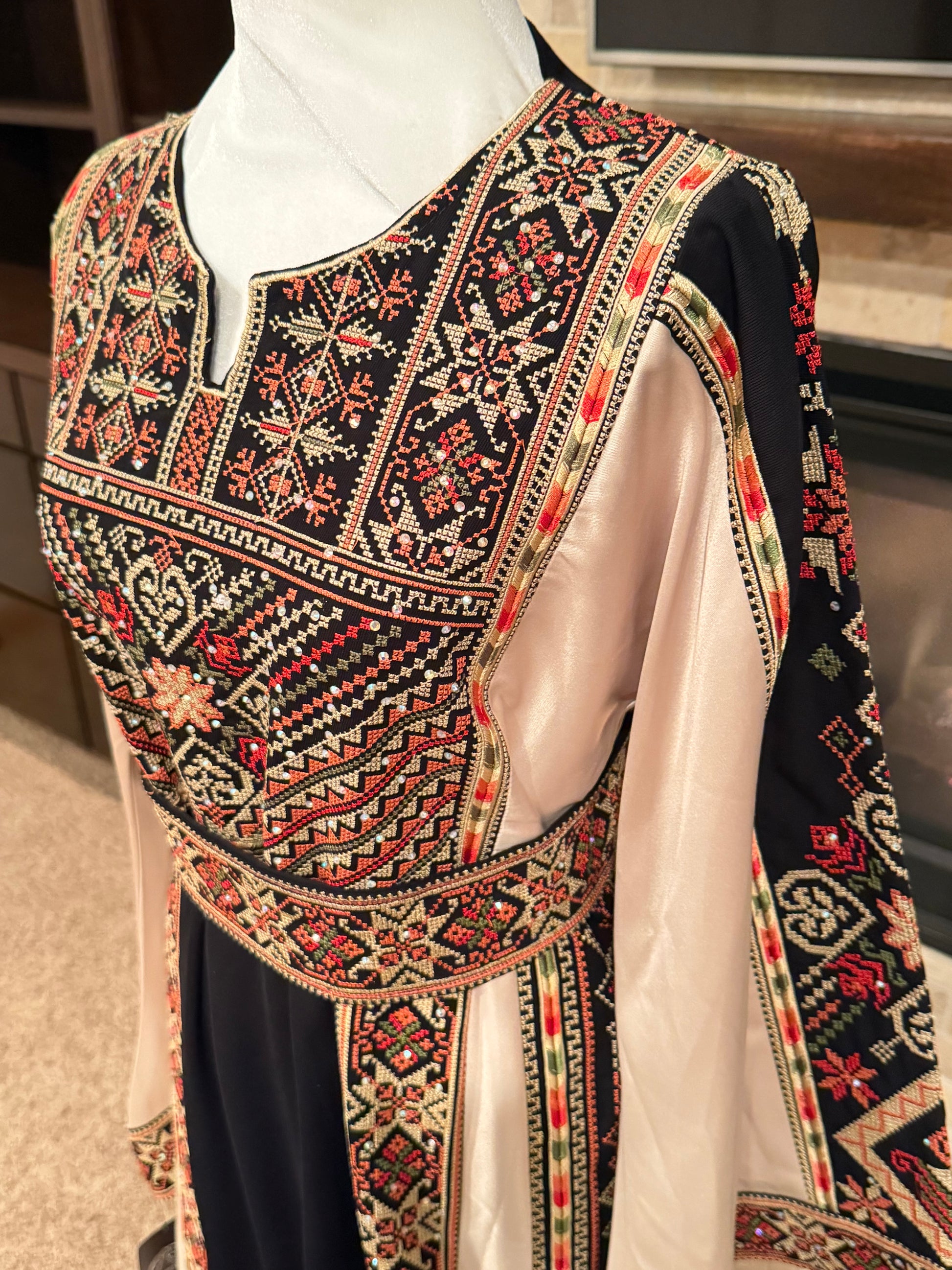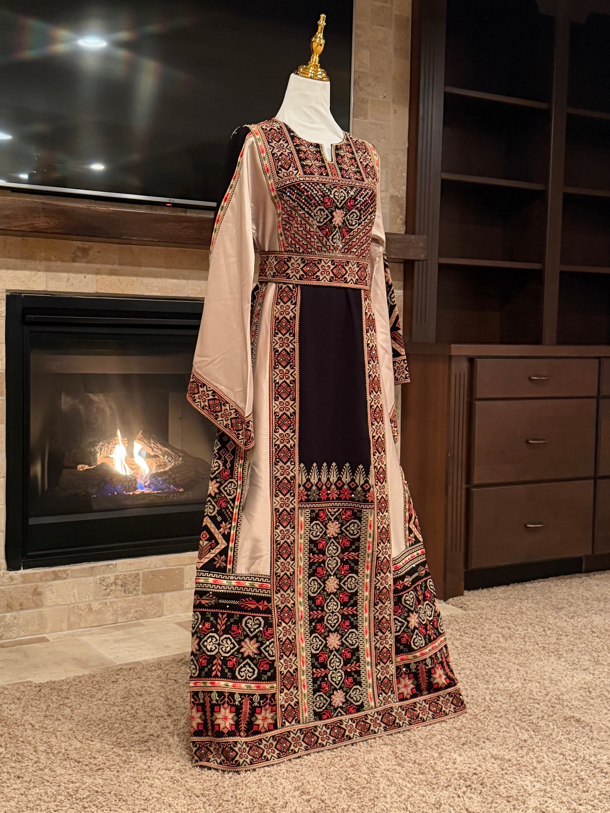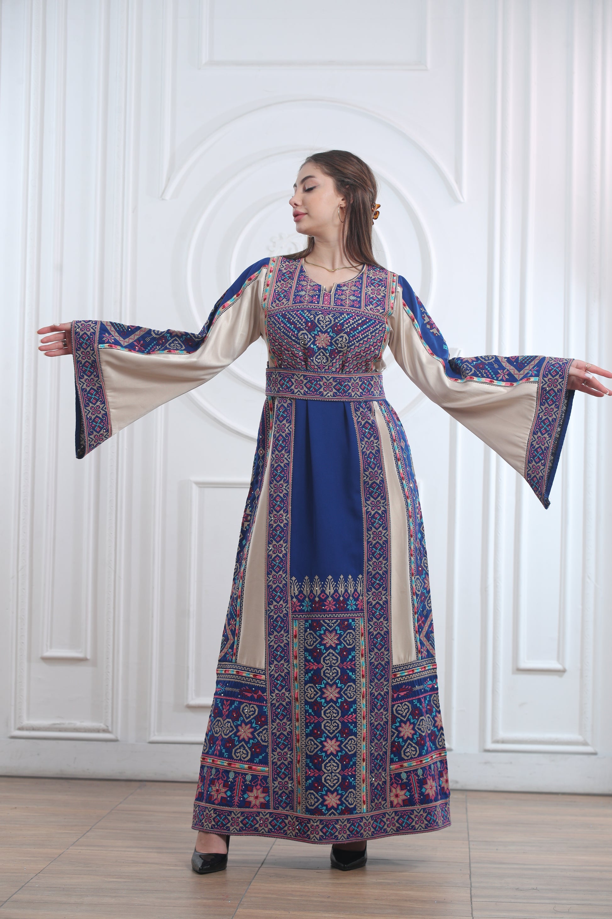 The Al Qamar Thobe blends elegance with traditional artistry. Its intricate embroidery flows across the front, sleeves, and hem, creating a refined and eye-catching design. The soft satin panels add a gentle shine, while the wide draped sleeves give it a graceful, timeless charm.