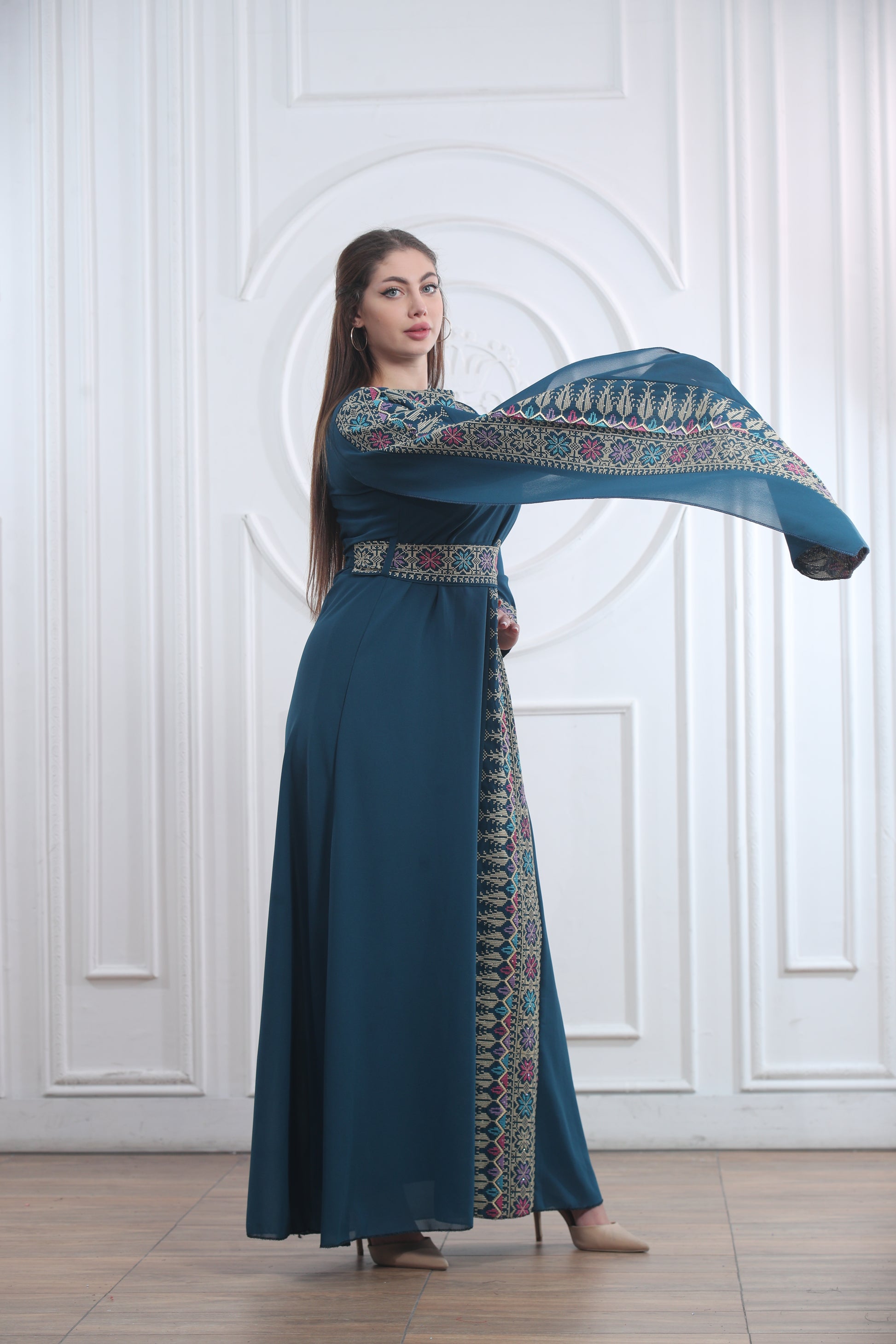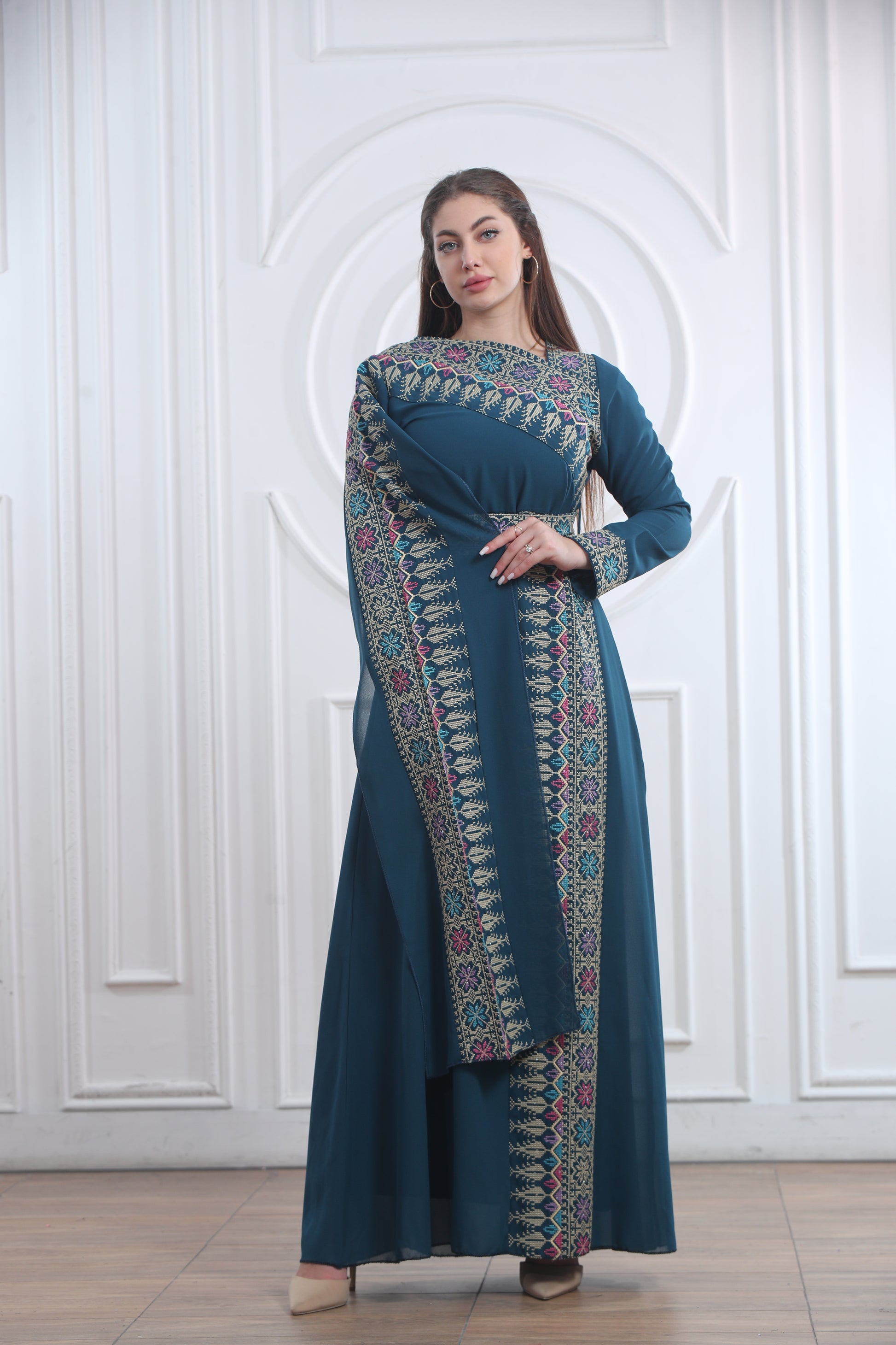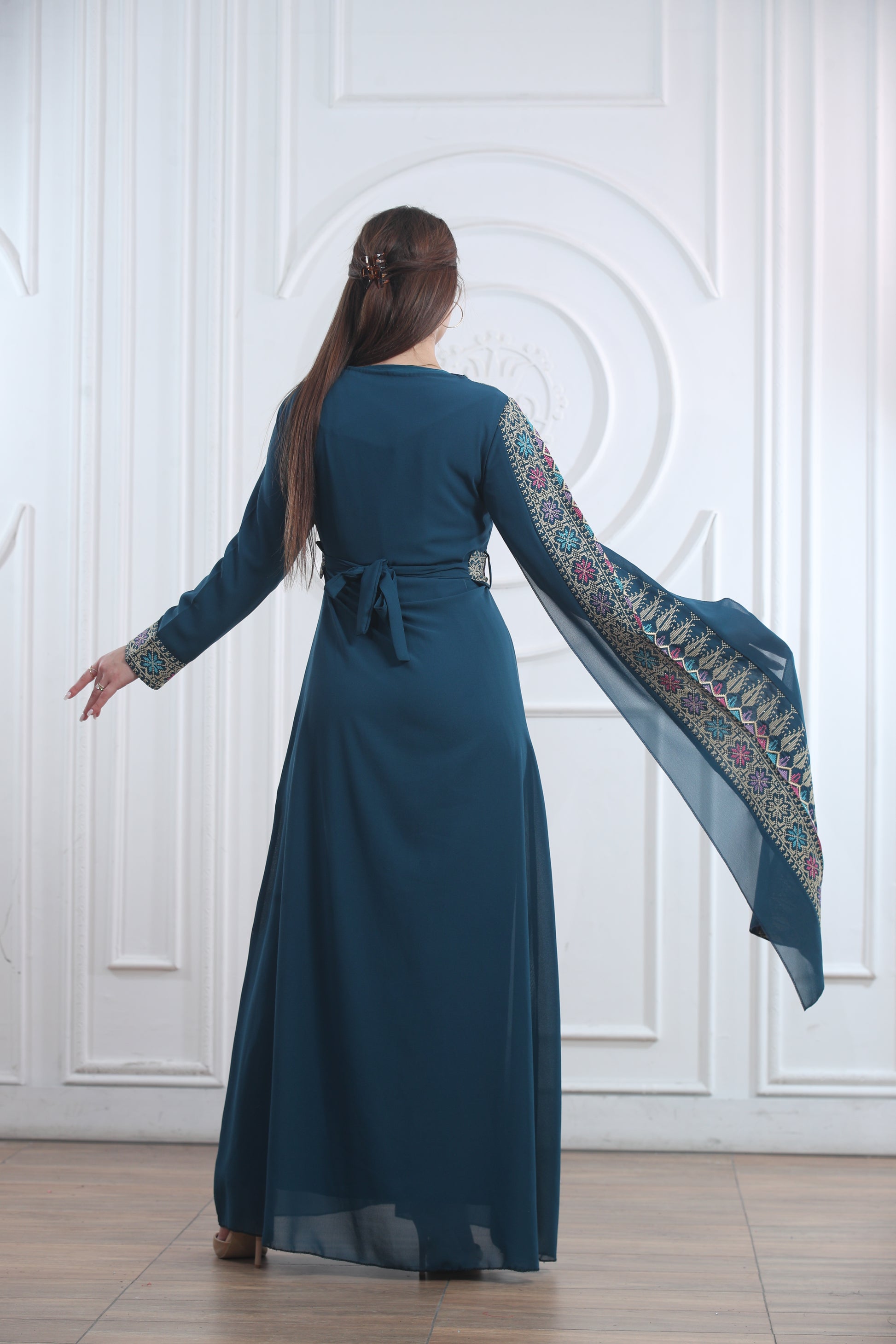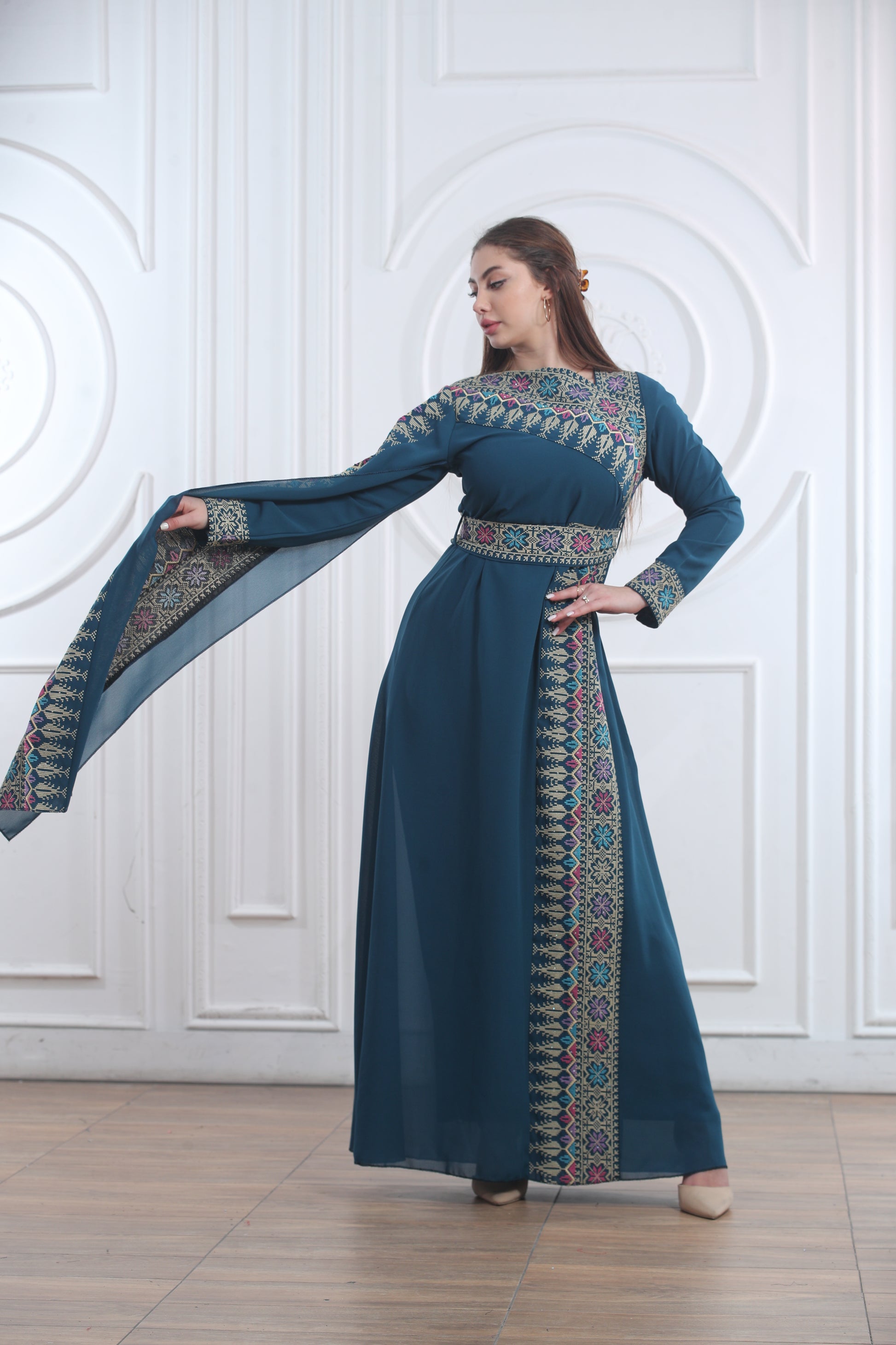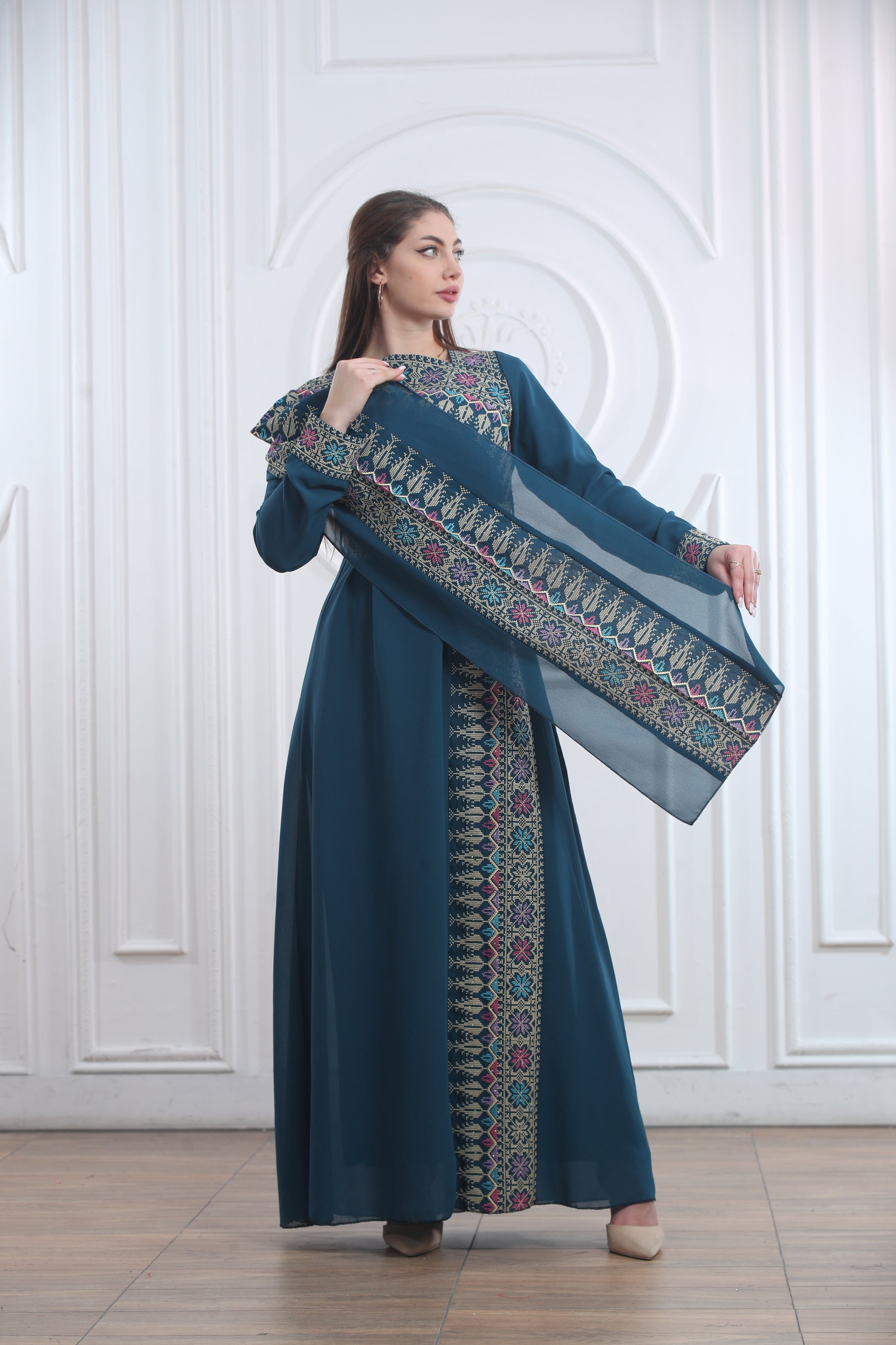 This elegant one-piece Layl Nahar Thobe features beautiful embroidery along the neckline, chest, sleeves, and front design. It flows gracefully and offers a comfortable fit that’s perfect for both everyday wear and special occasions. The unique design includes one regular sleeve and one long, flowy sleeve for a modern touch while keeping a traditional look. Perfect for cultural events, Eid, or formal gatherings, this thobe blends modesty and elegance effortlessly.