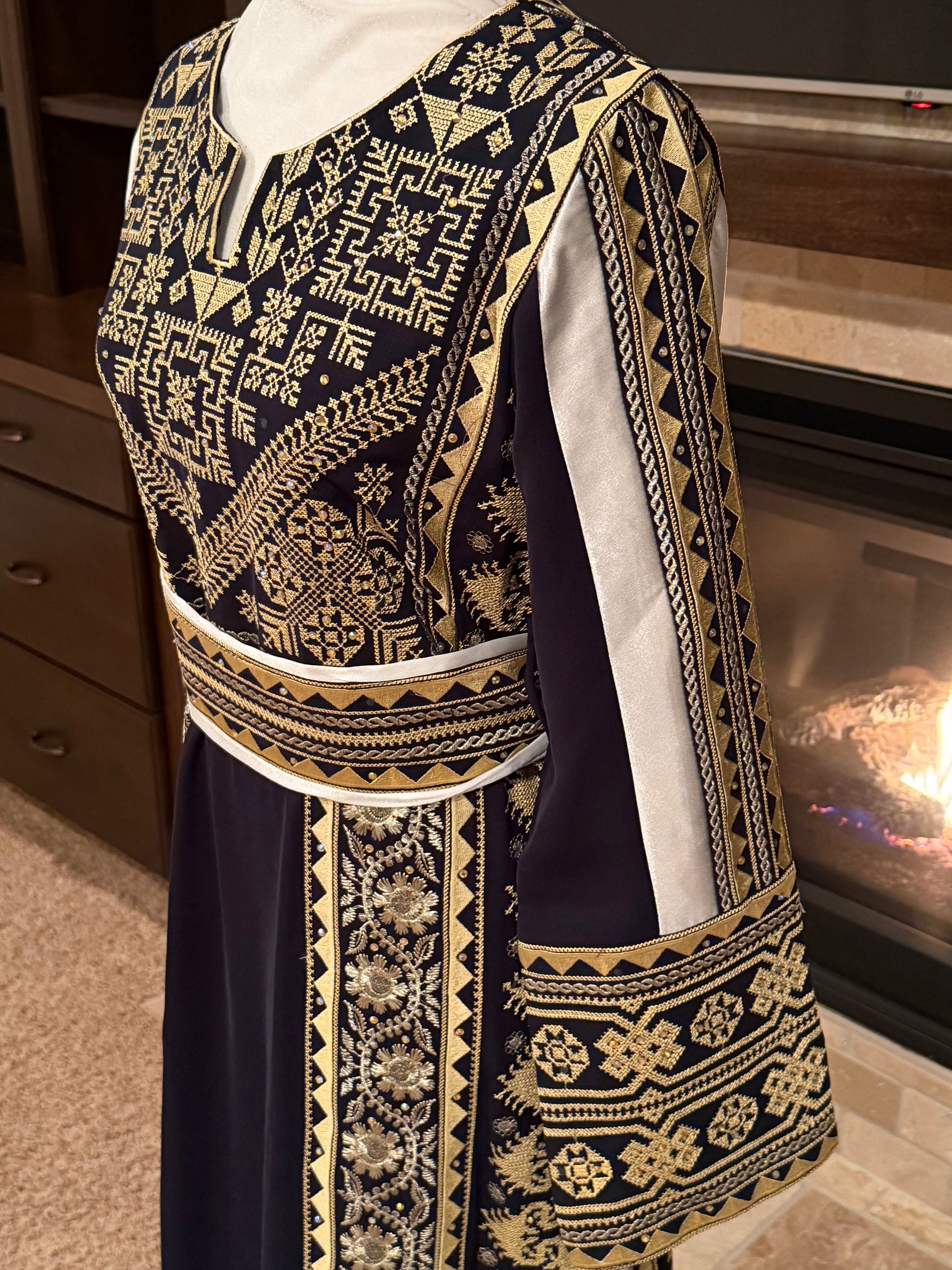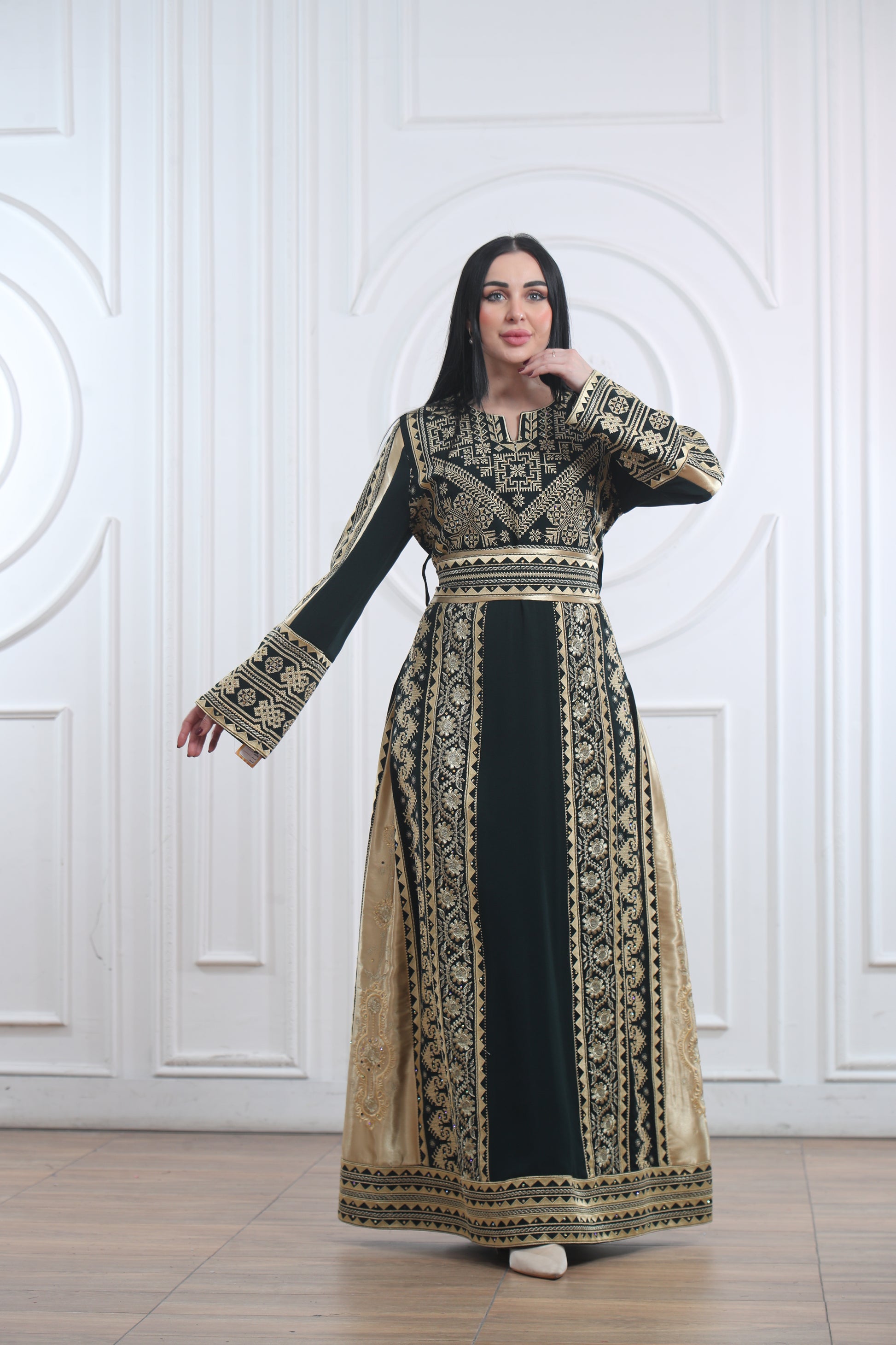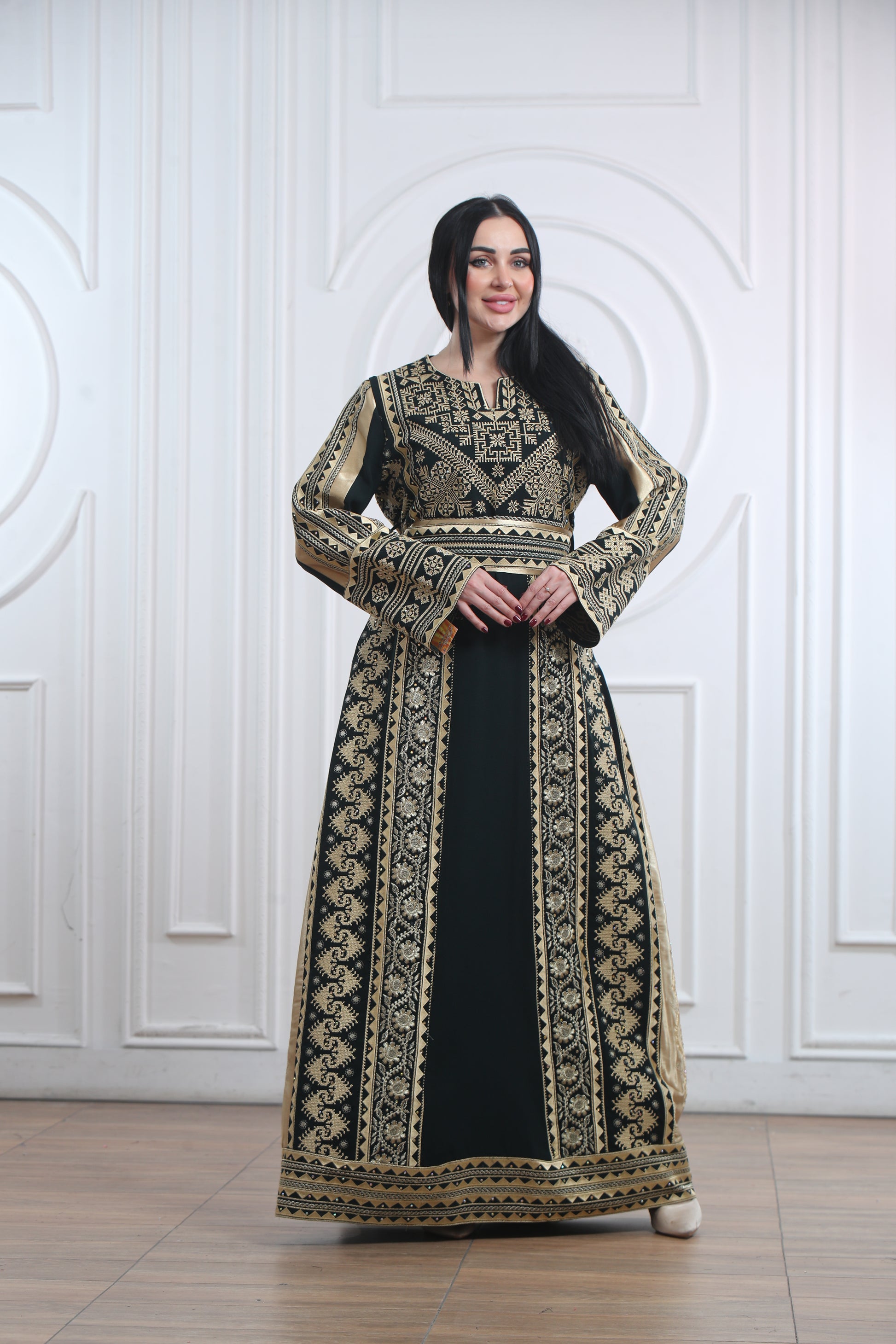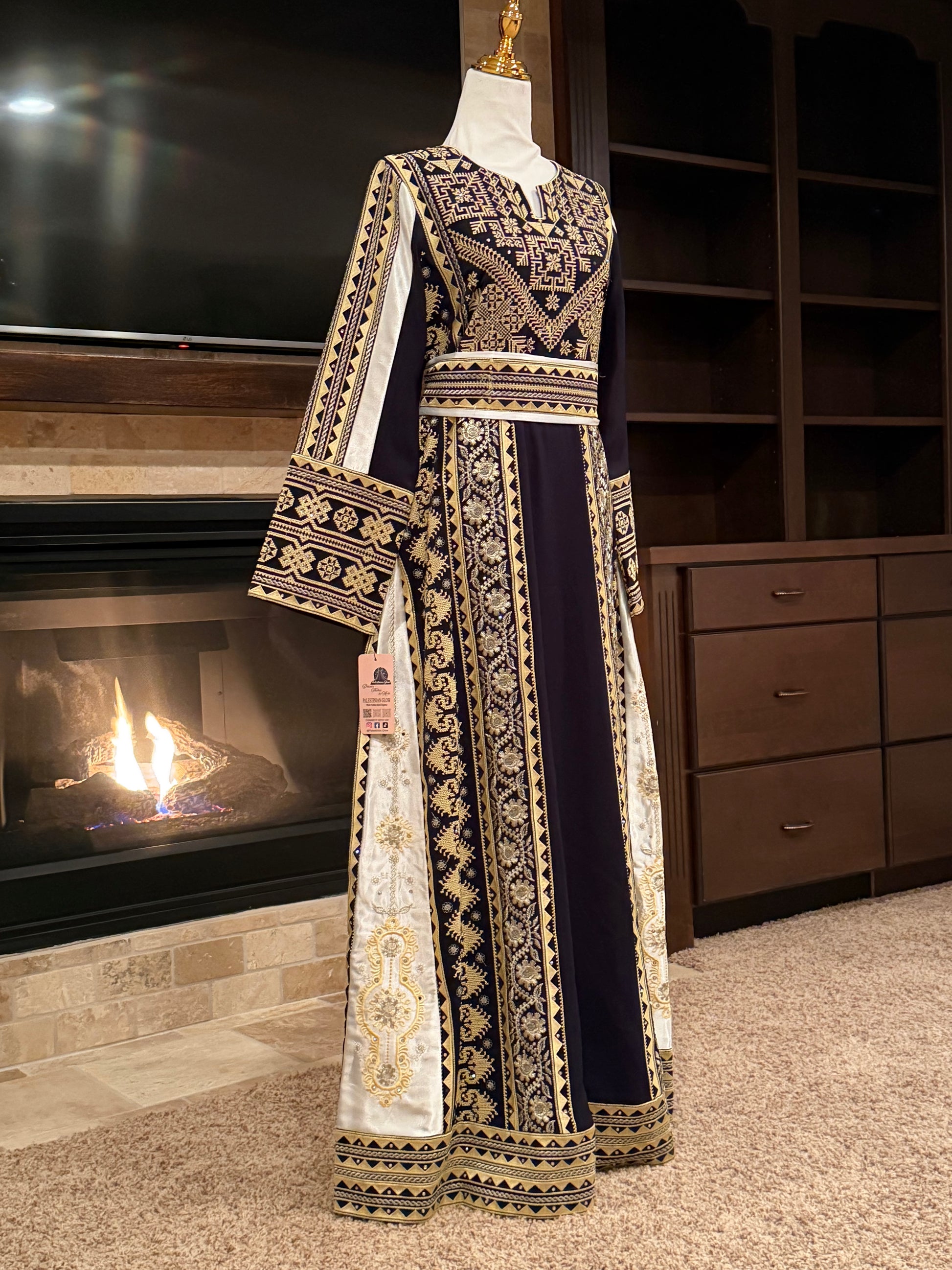The Majdalawi Thobe showcases a timeless design inspired by traditional Palestinian heritage. It features detailed embroidery along the front, sleeves, and borders, creating a rich and elegant look. Satin panels add a soft shine, while the long and flowing style gives it a graceful and classic feel.