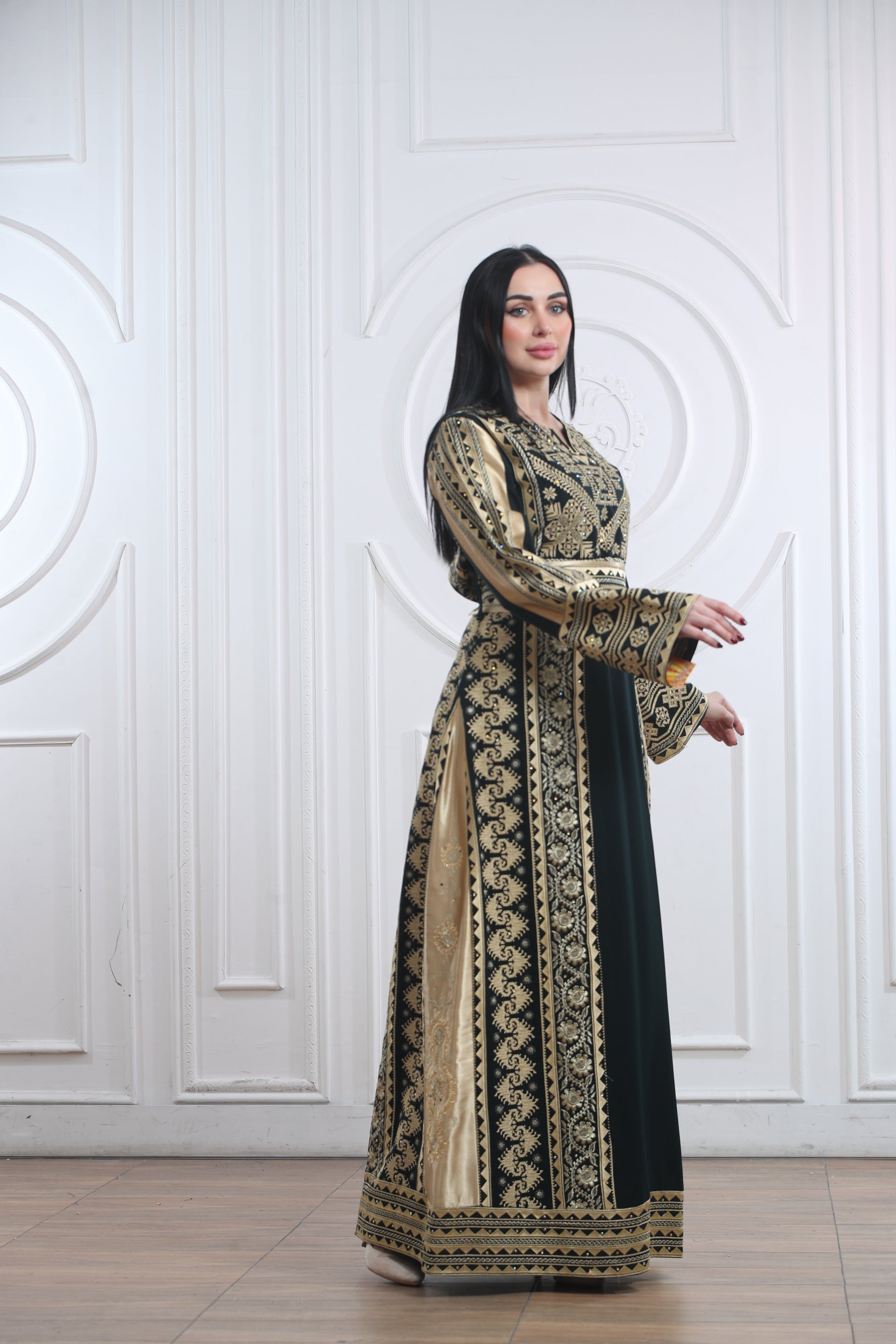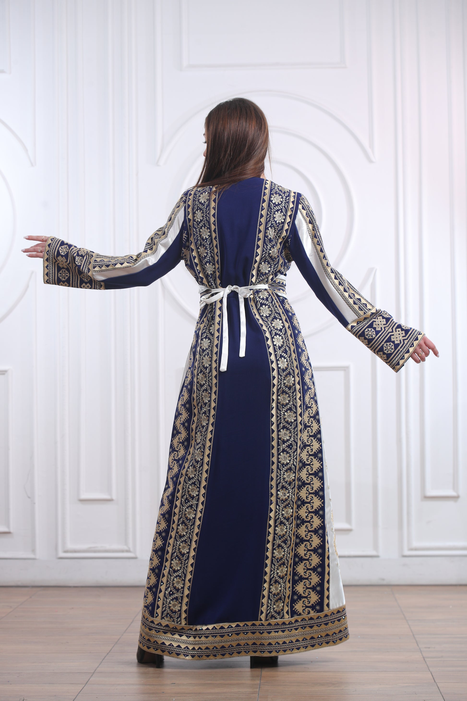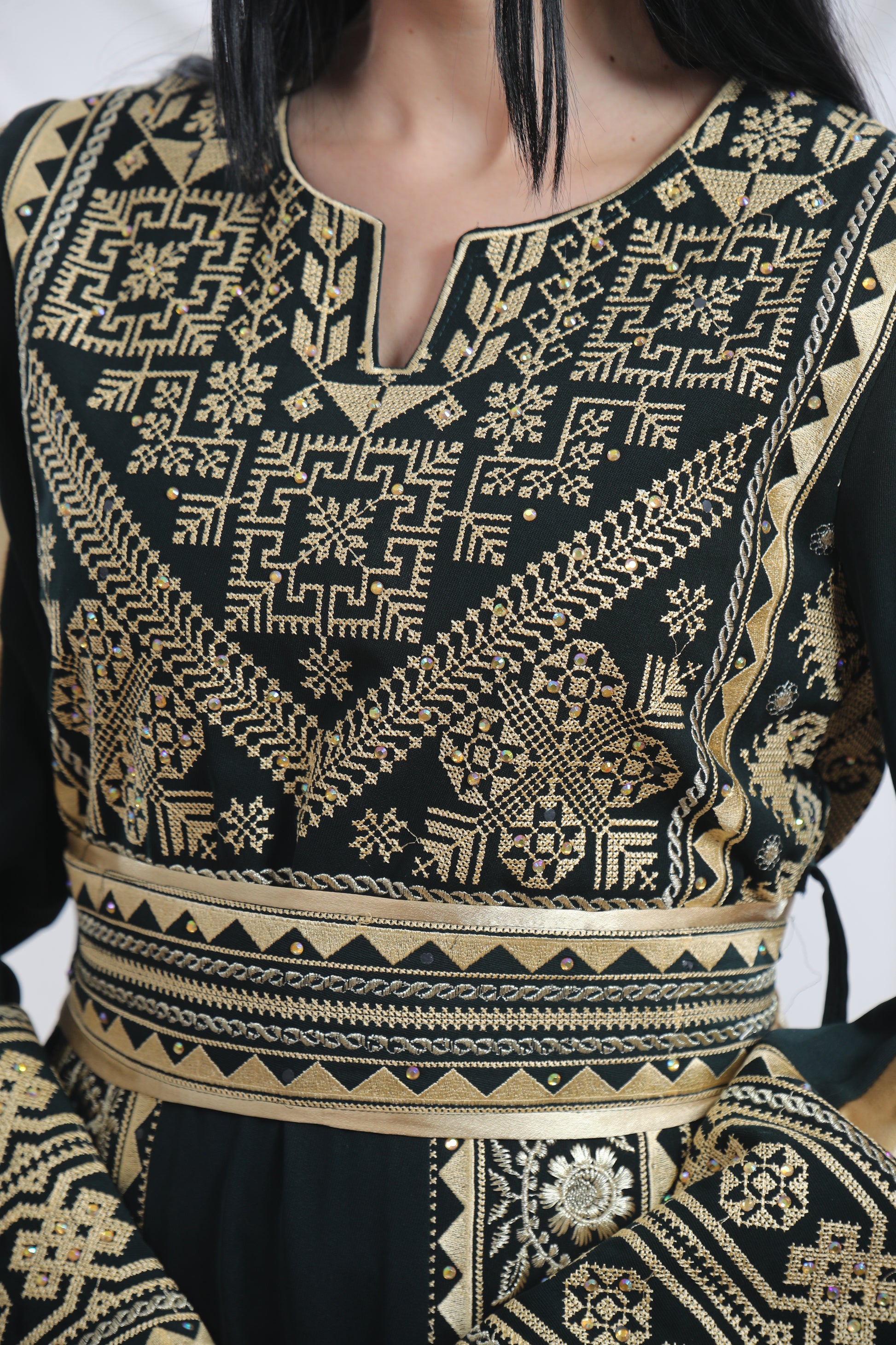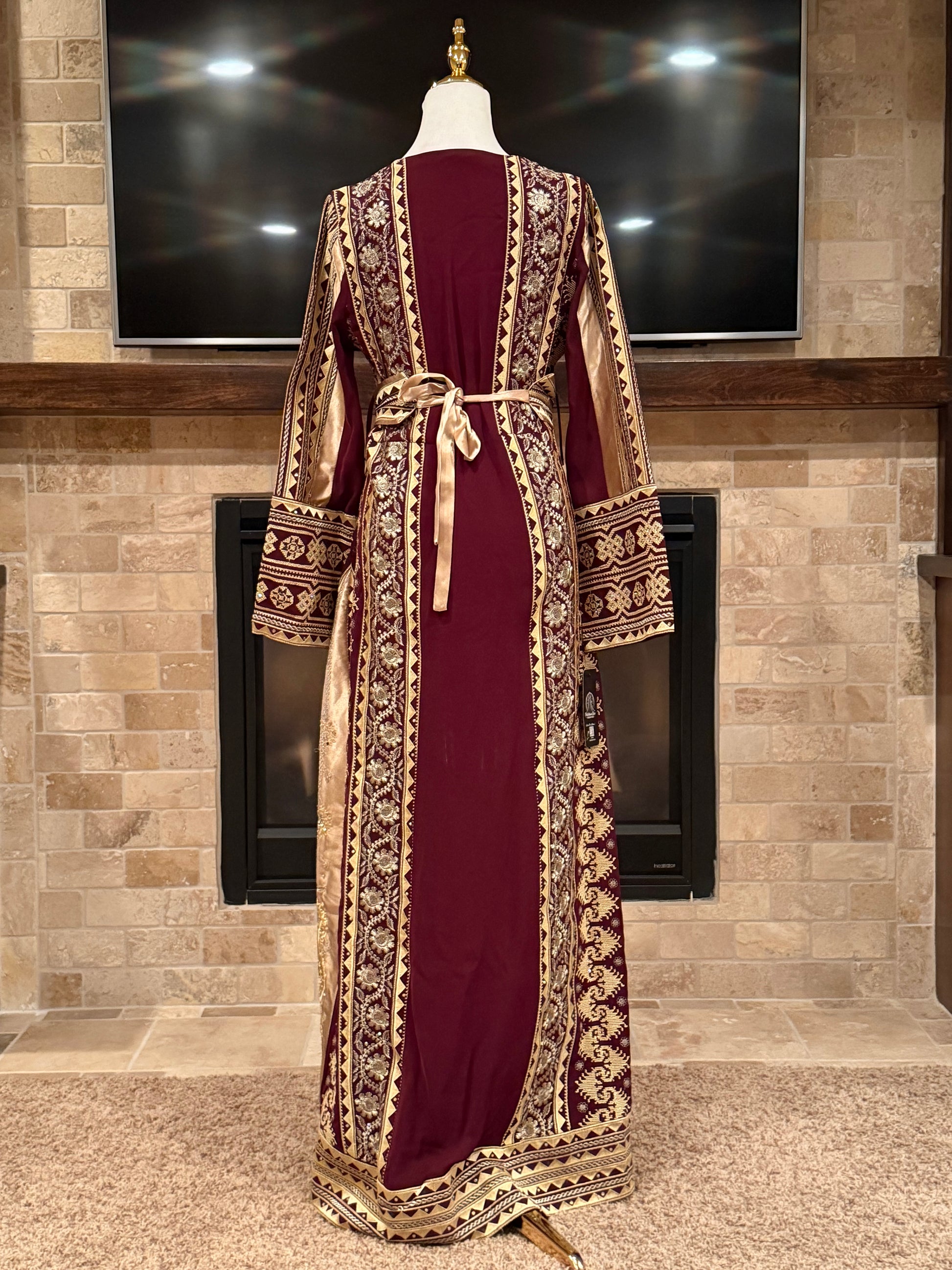 The Majdalawi Thobe showcases a timeless design inspired by traditional Palestinian heritage. It features detailed embroidery along the front, sleeves, and borders, creating a rich and elegant look. Satin panels add a soft shine, while the long and flowing style gives it a graceful and classic feel.