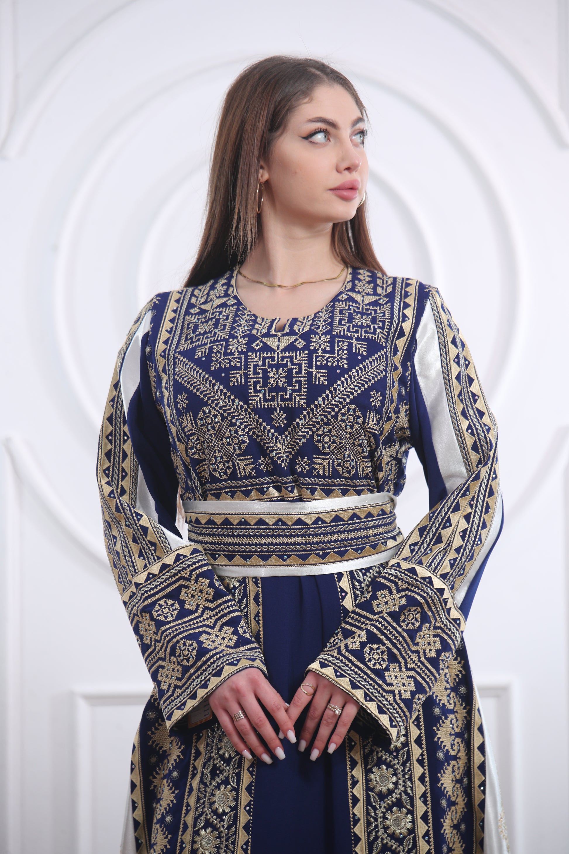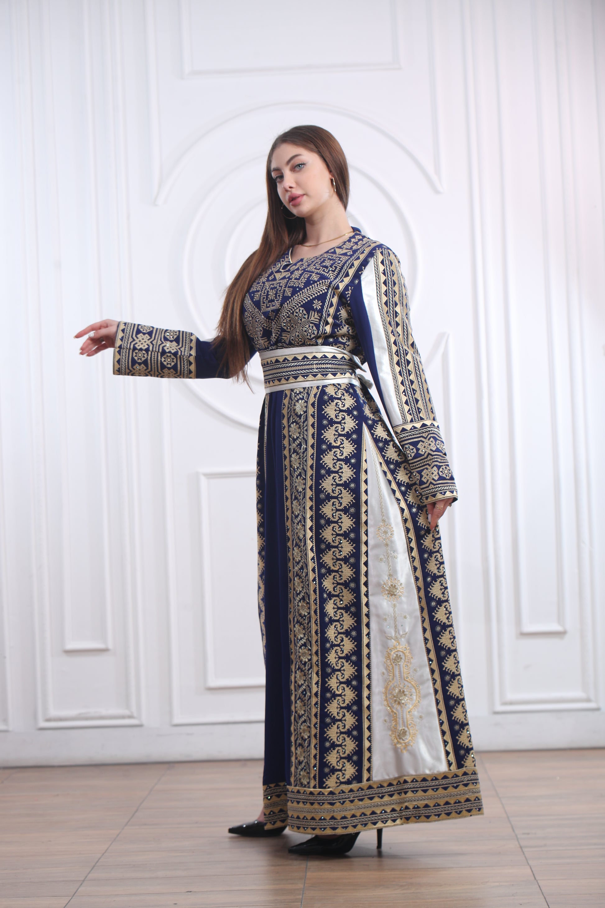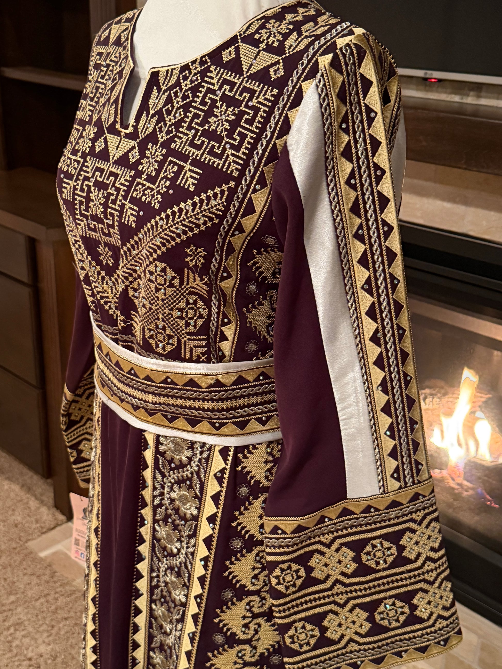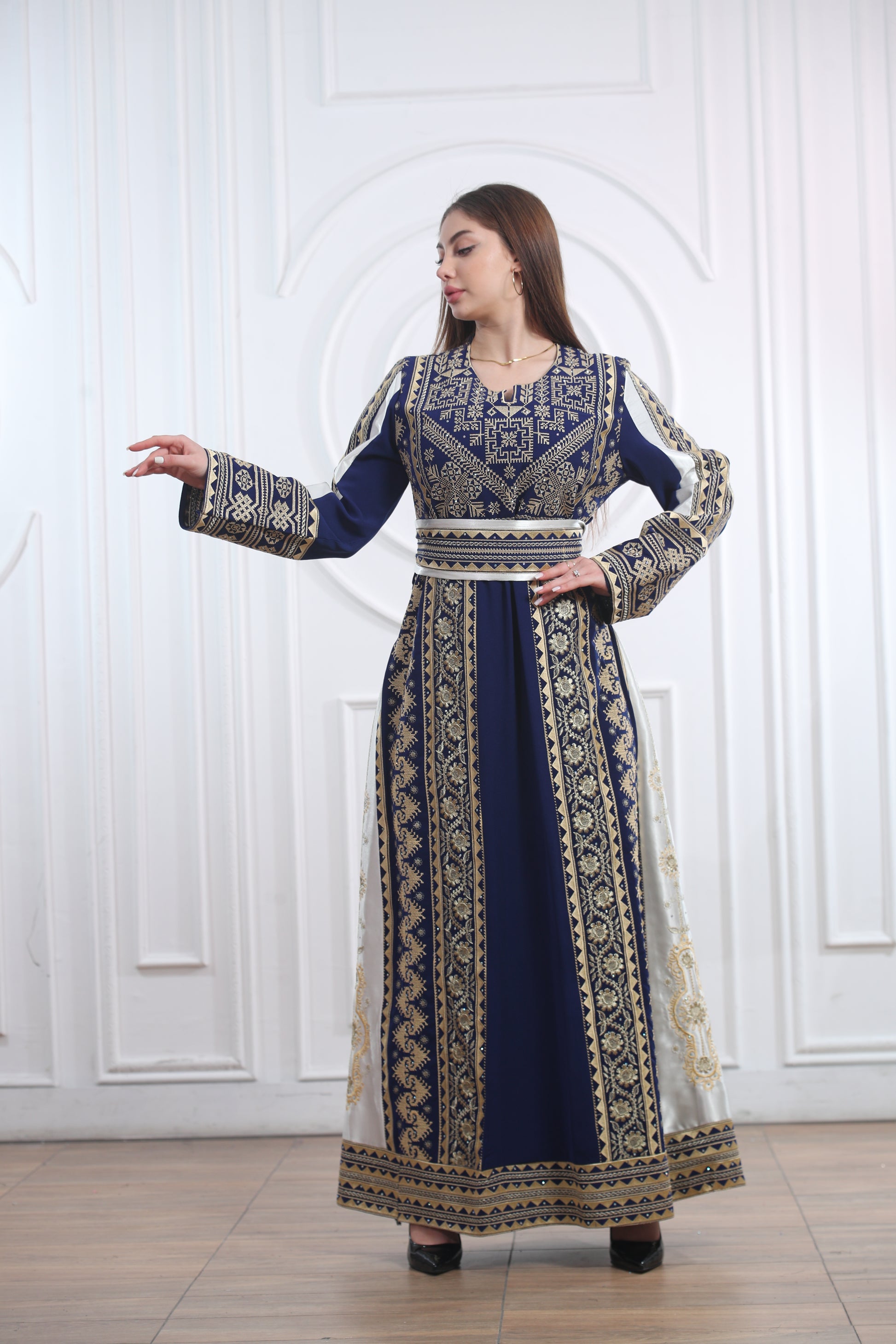 The Majdalawi Thobe showcases a timeless design inspired by traditional Palestinian heritage. It features detailed embroidery along the front, sleeves, and borders, creating a rich and elegant look. Satin panels add a soft shine, while the long and flowing style gives it a graceful and classic feel.