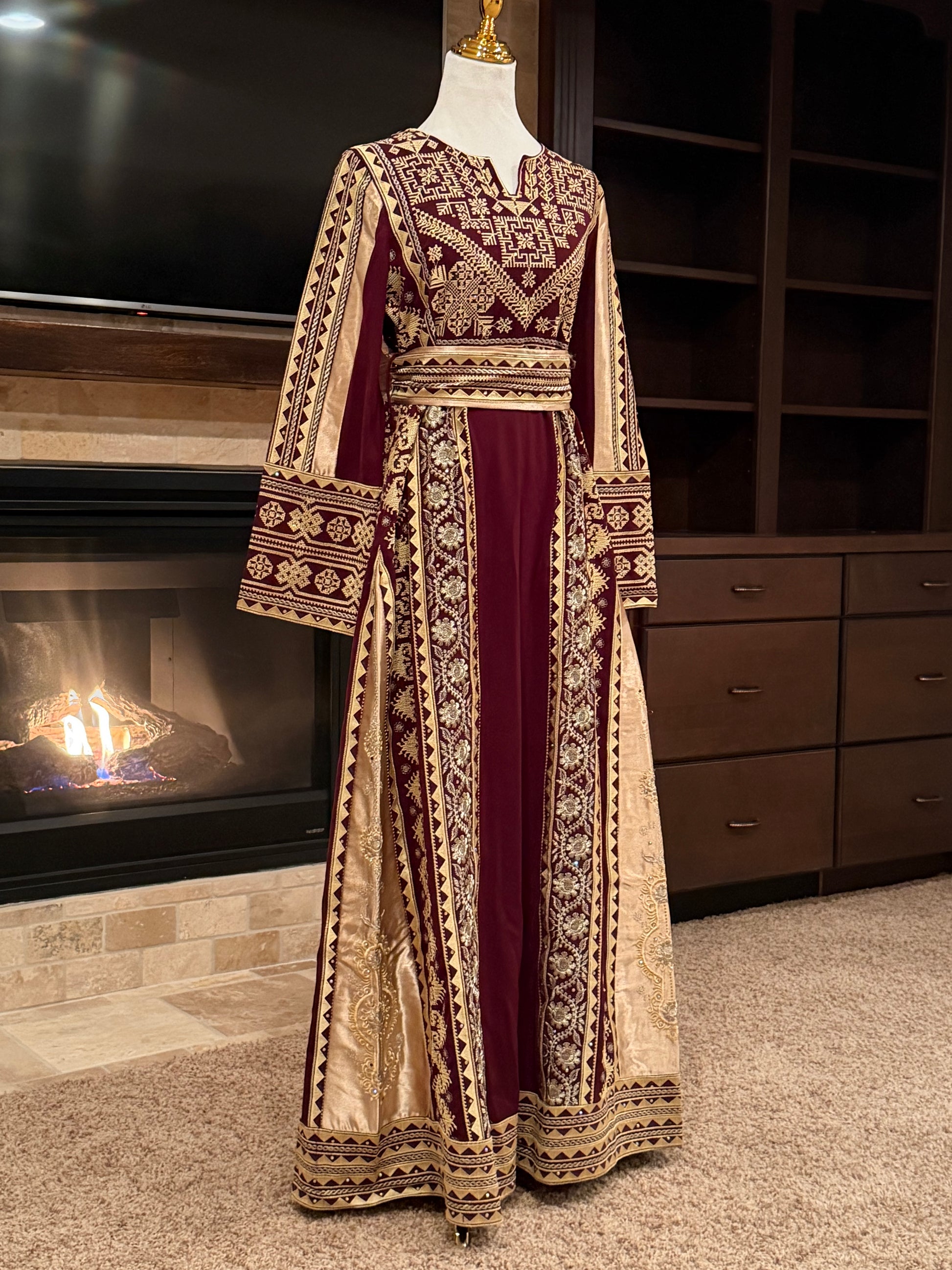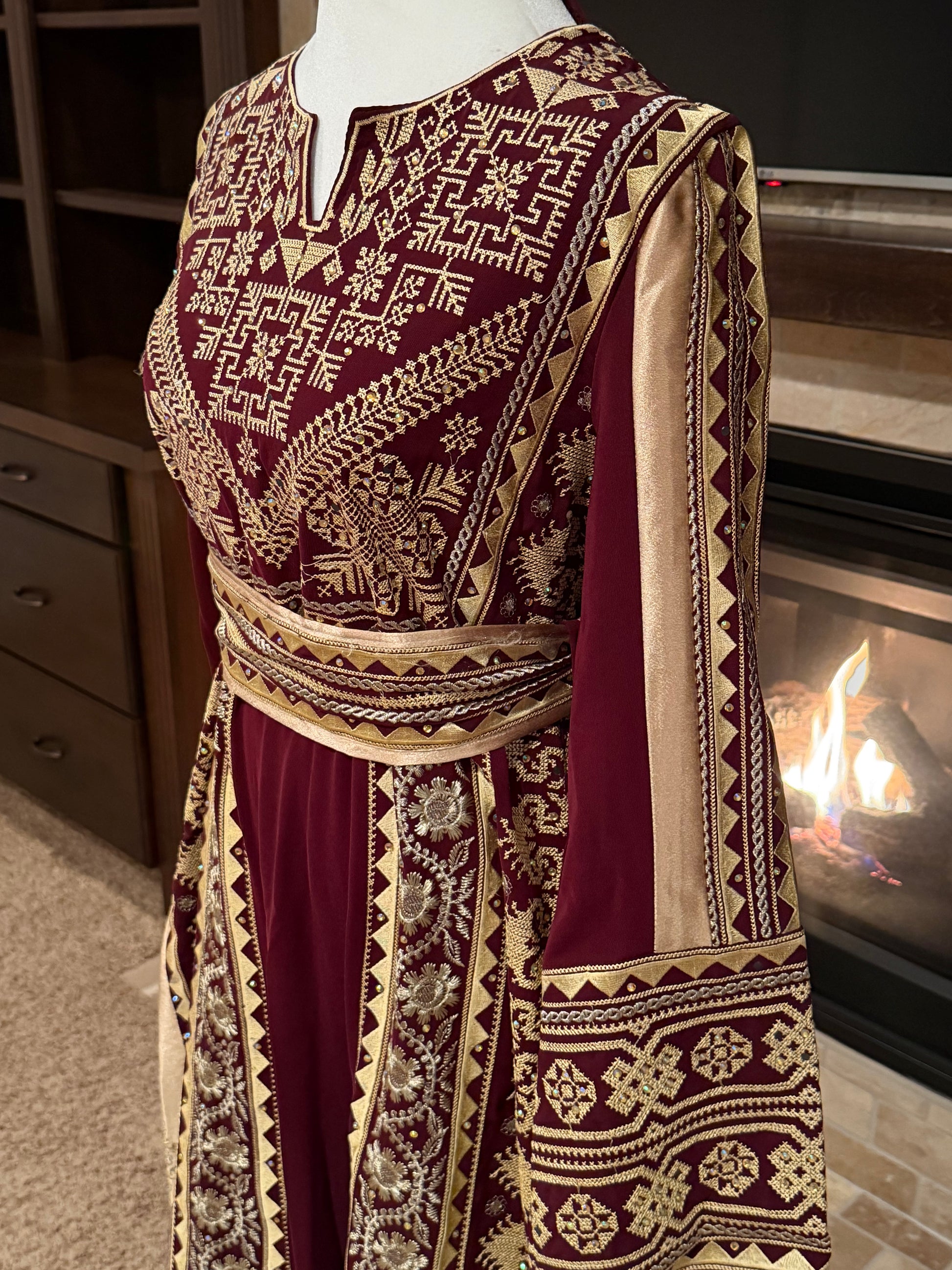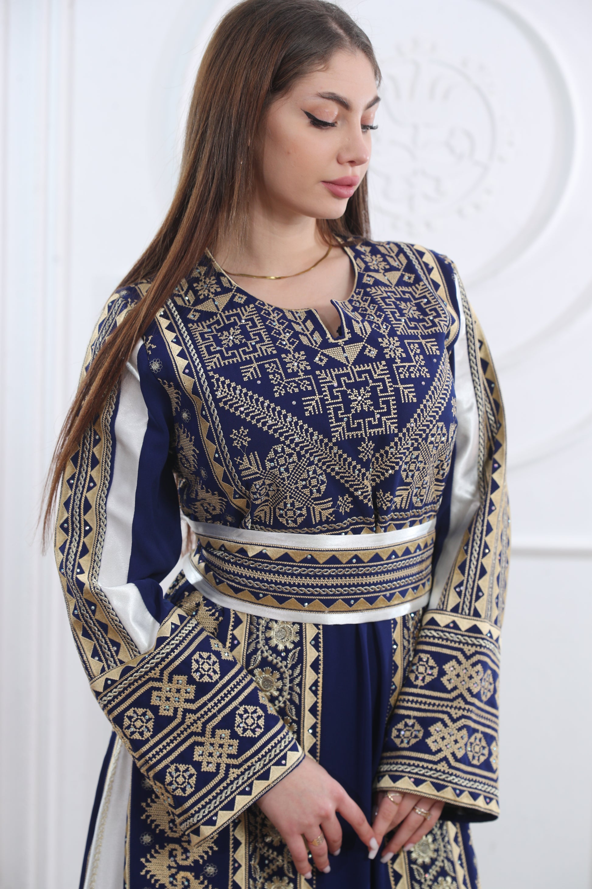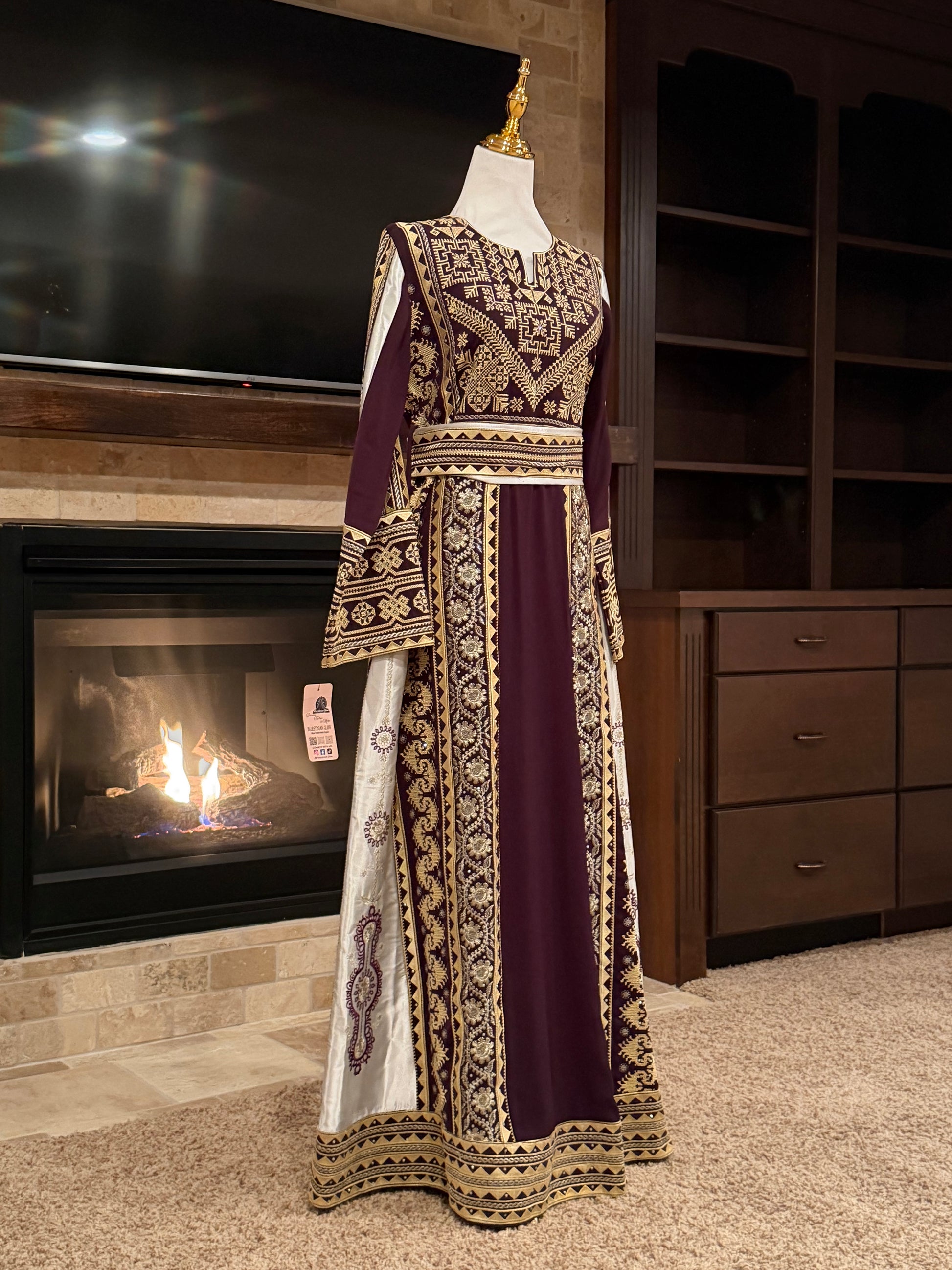 The Majdalawi Thobe showcases a timeless design inspired by traditional Palestinian heritage. It features detailed embroidery along the front, sleeves, and borders, creating a rich and elegant look. Satin panels add a soft shine, while the long and flowing style gives it a graceful and classic feel.