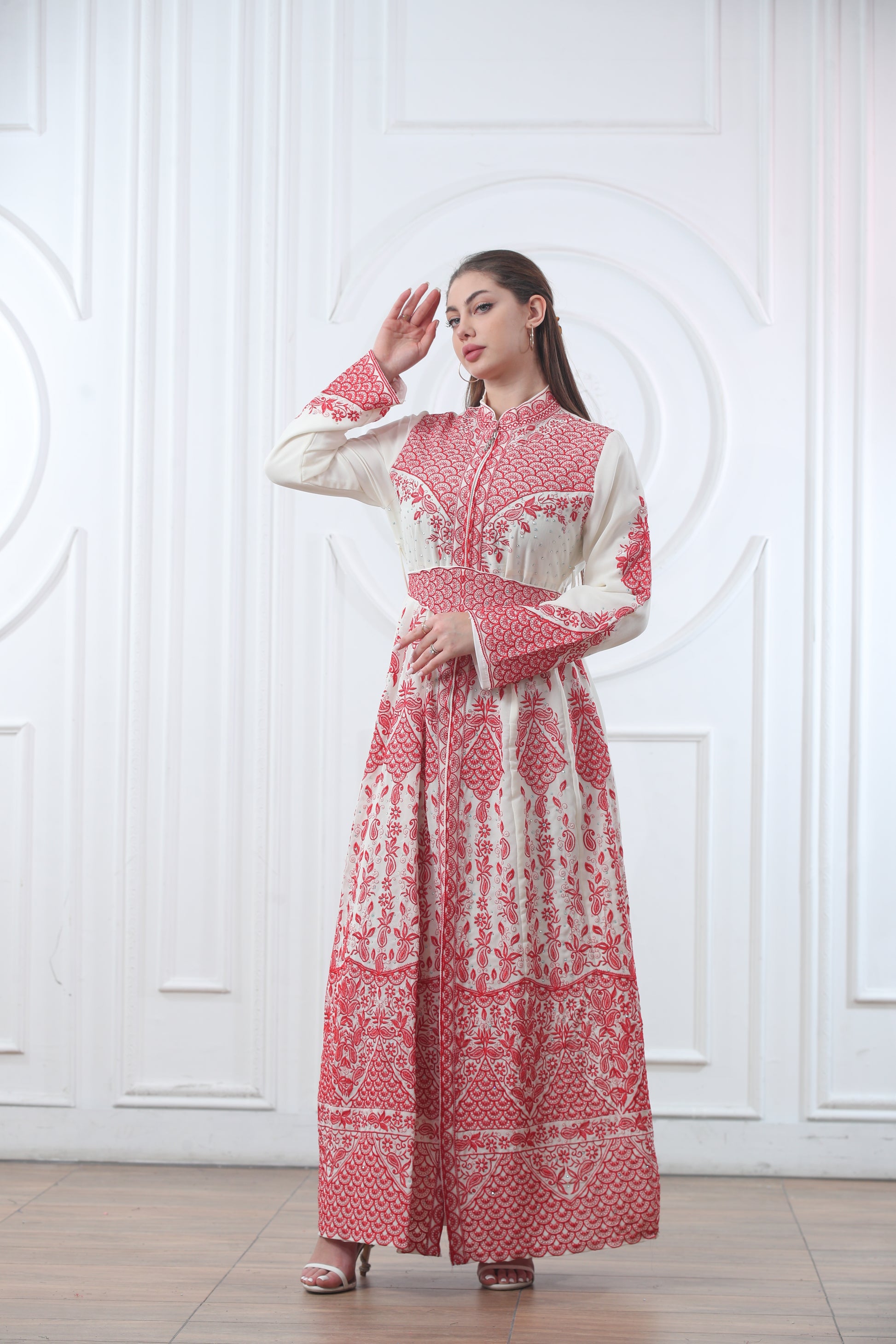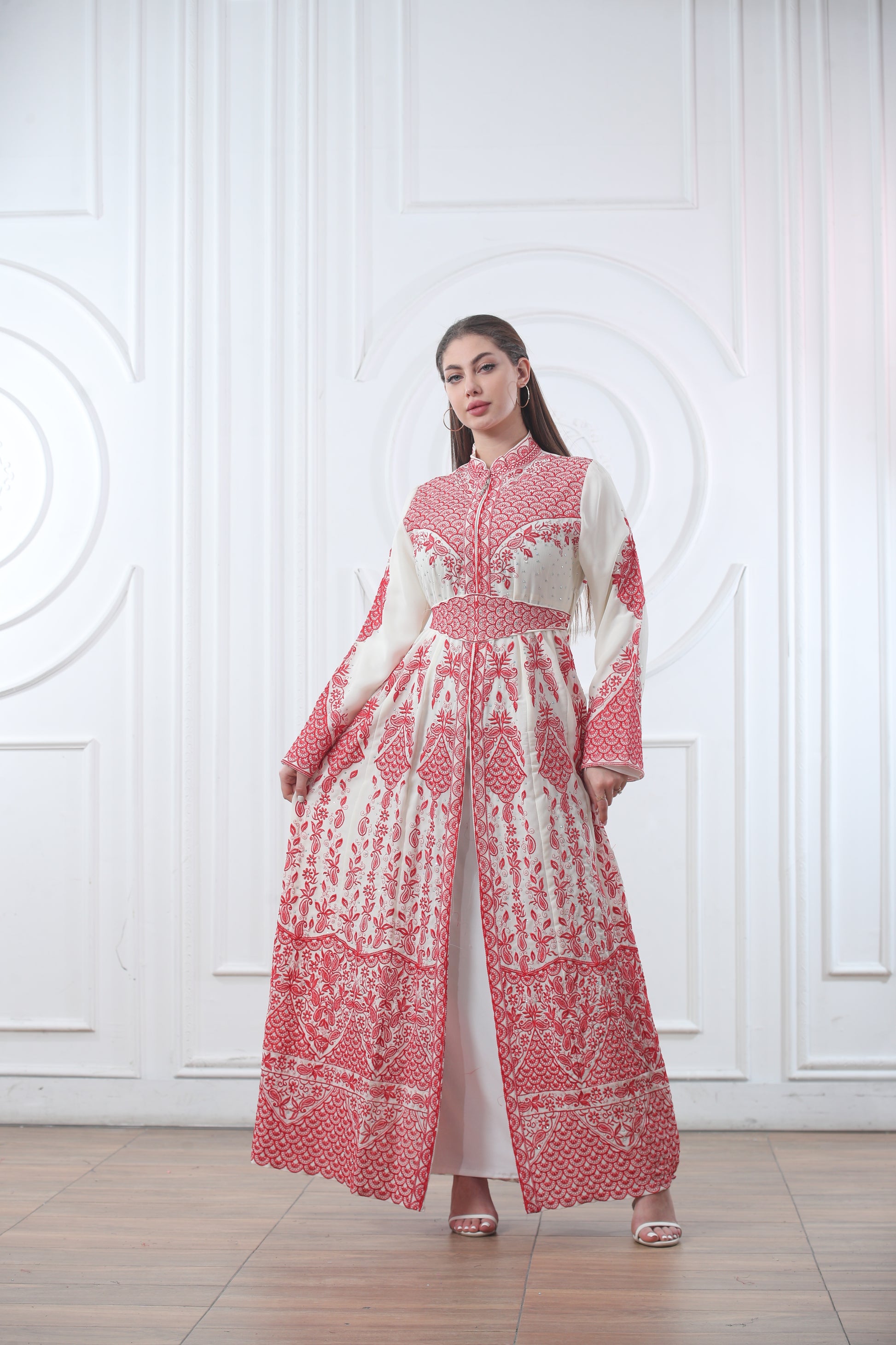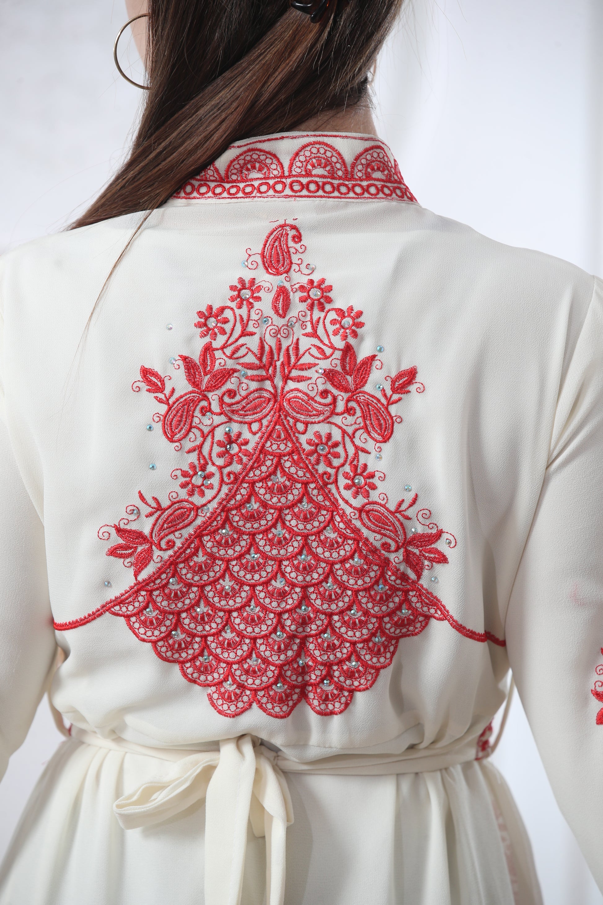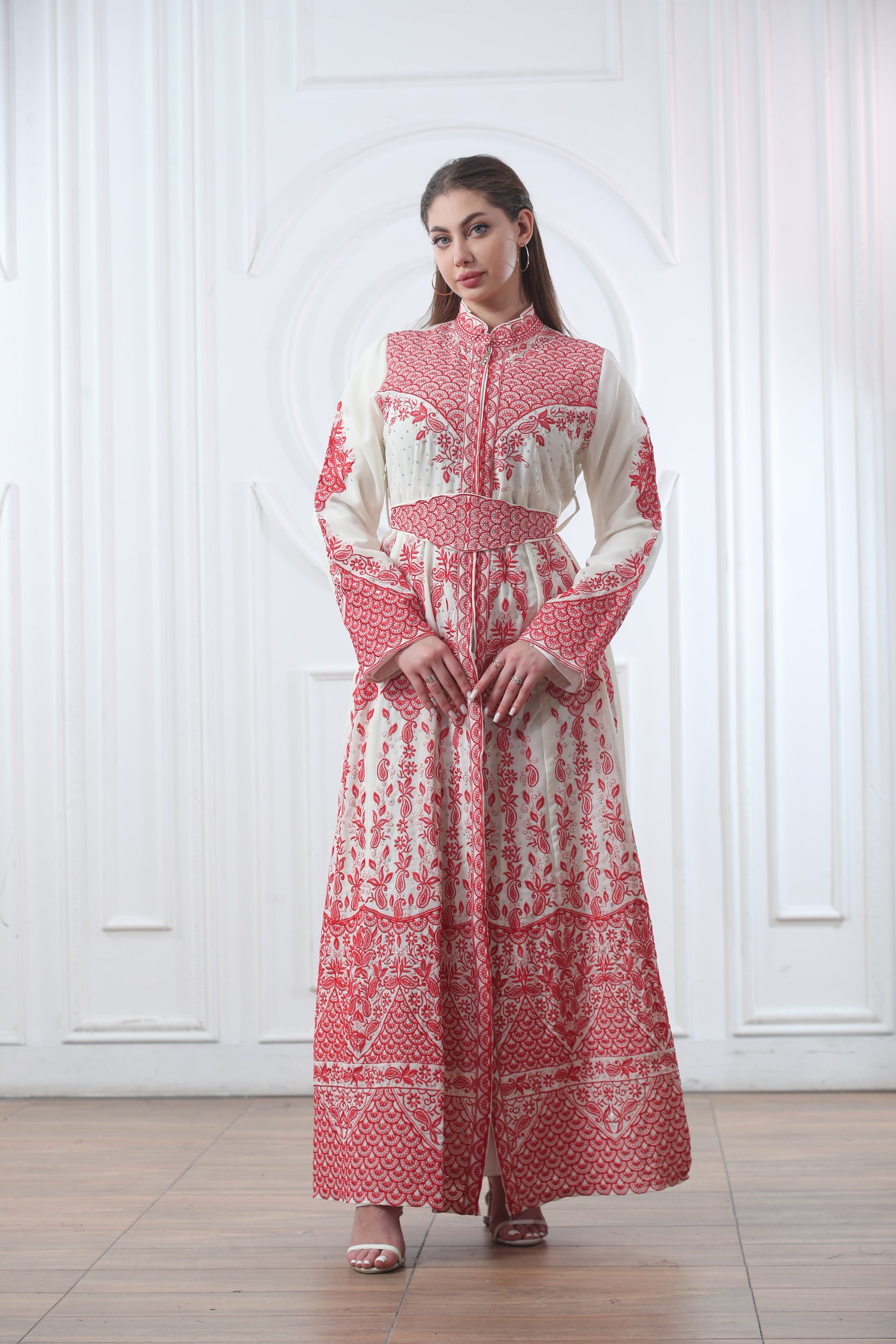The Jordanian Thobe stands out with its graceful flow and richly detailed design. Decorated with elegant threadwork across the bodice, sleeves, and hem, it brings a refined charm to any occasion. The high collar and matching belt create a polished shape, while the lightweight fabric ensures comfort and ease of movement. A timeless piece that blends tradition with modern sophistication.