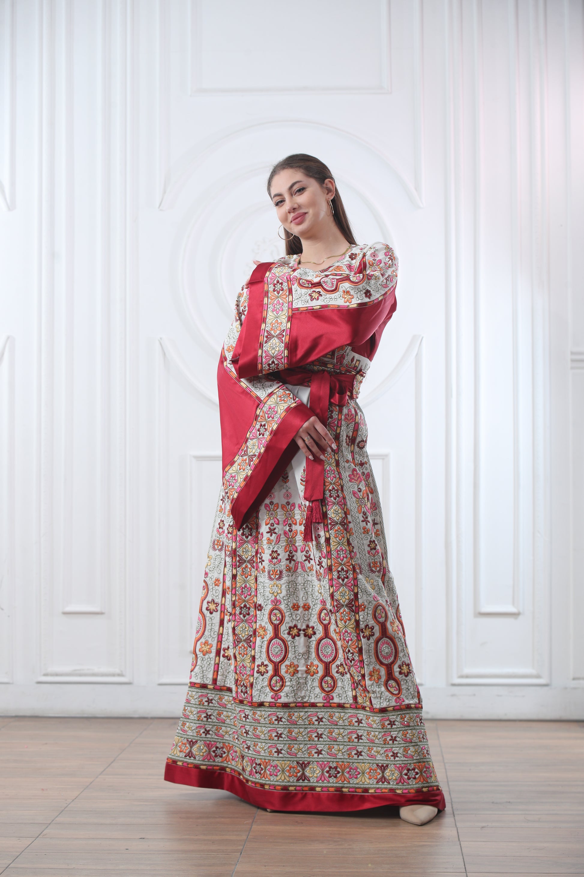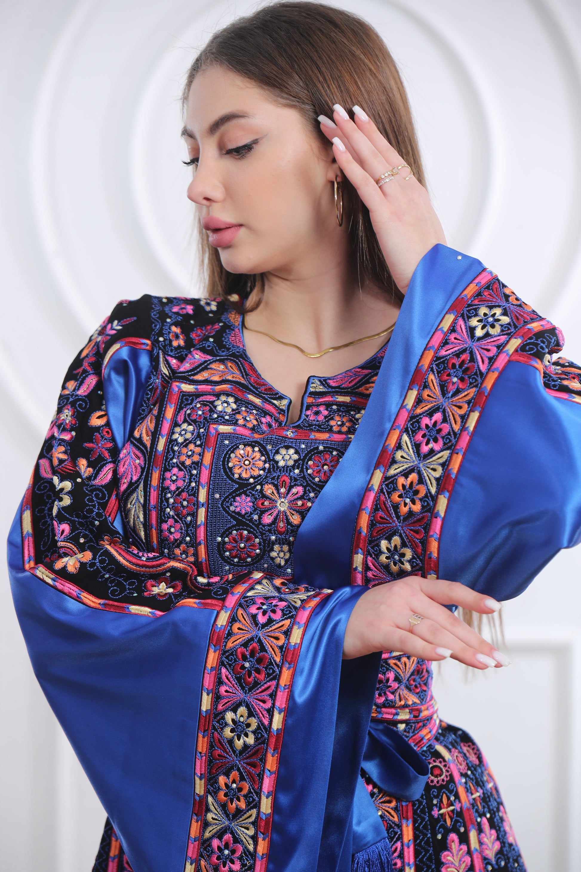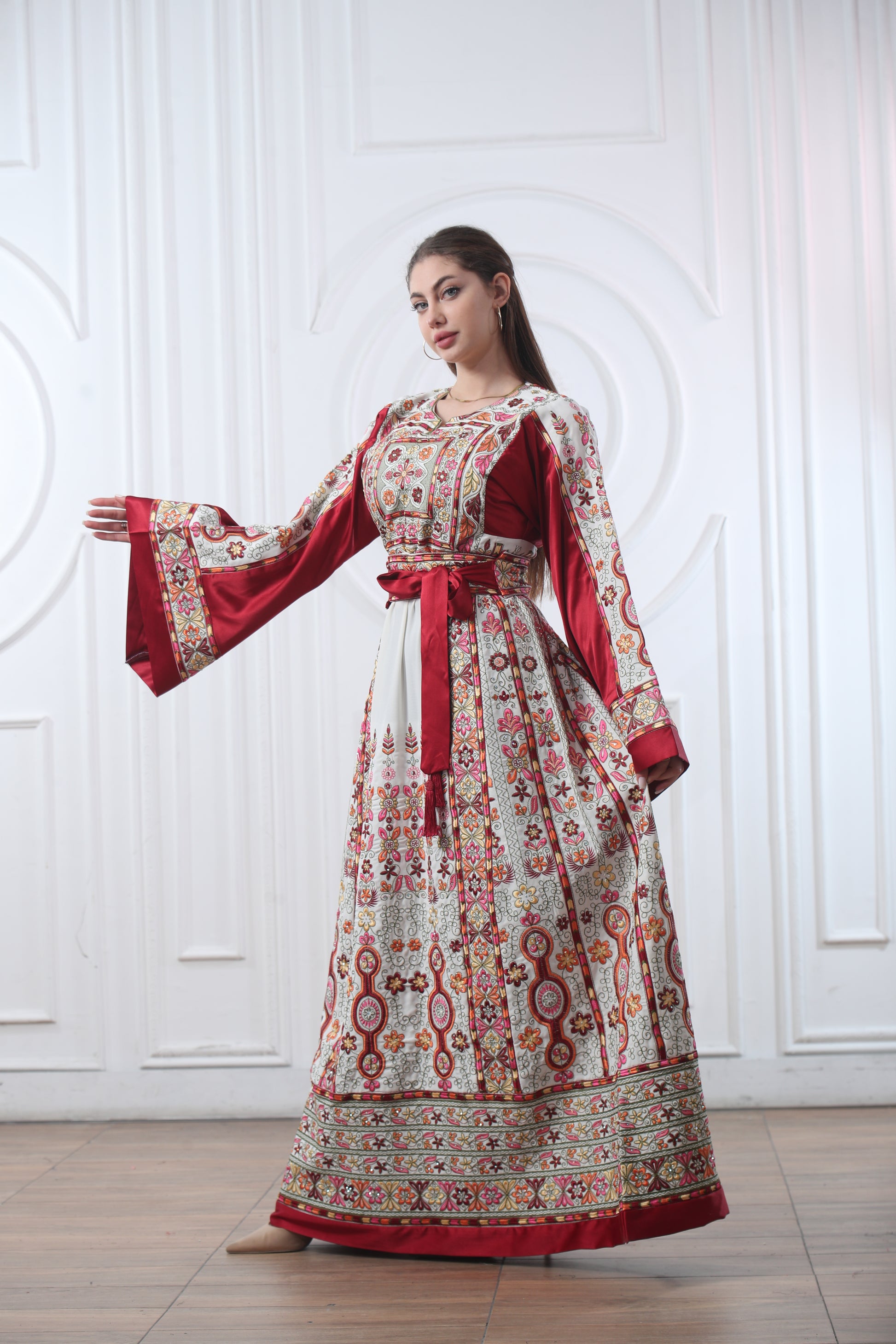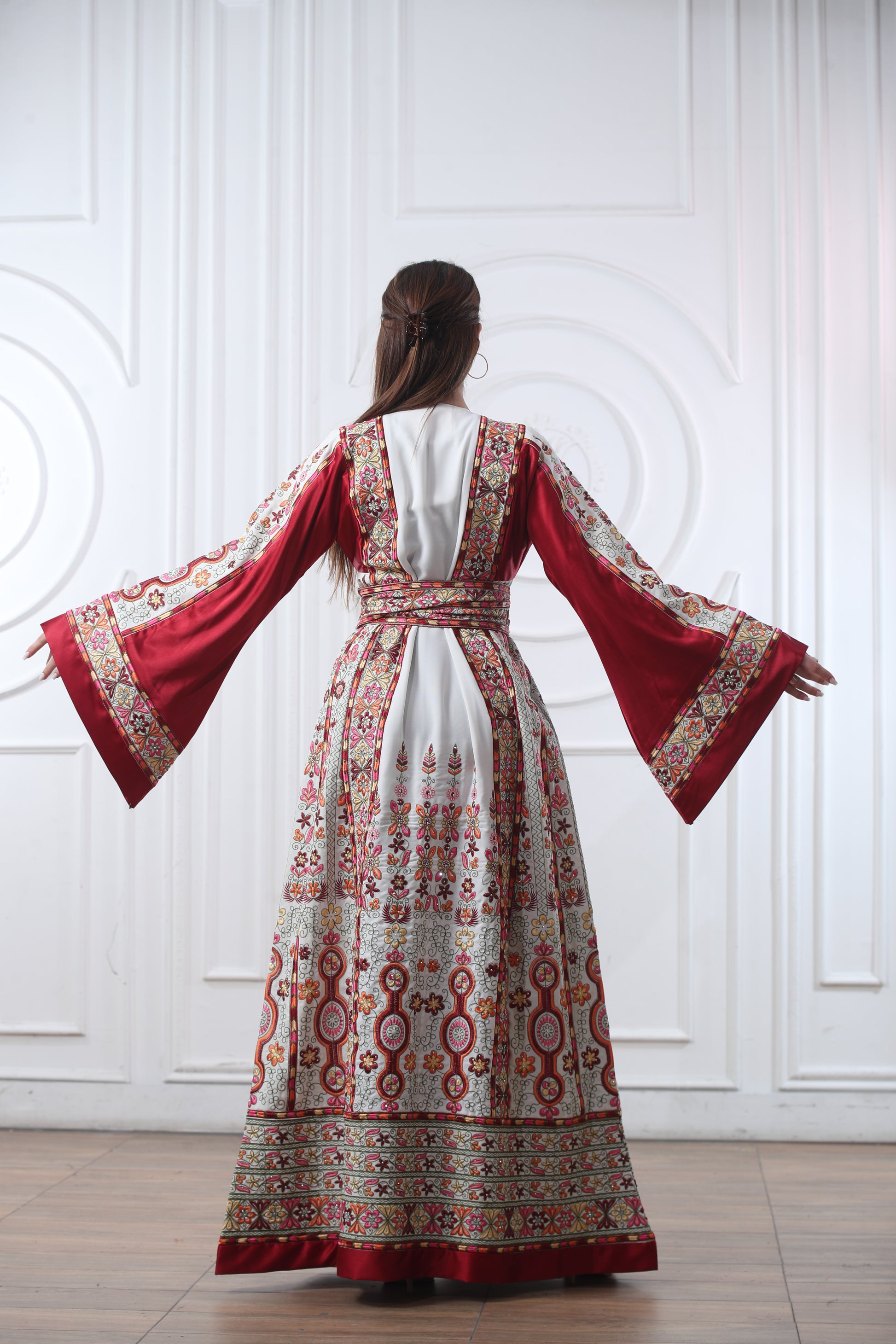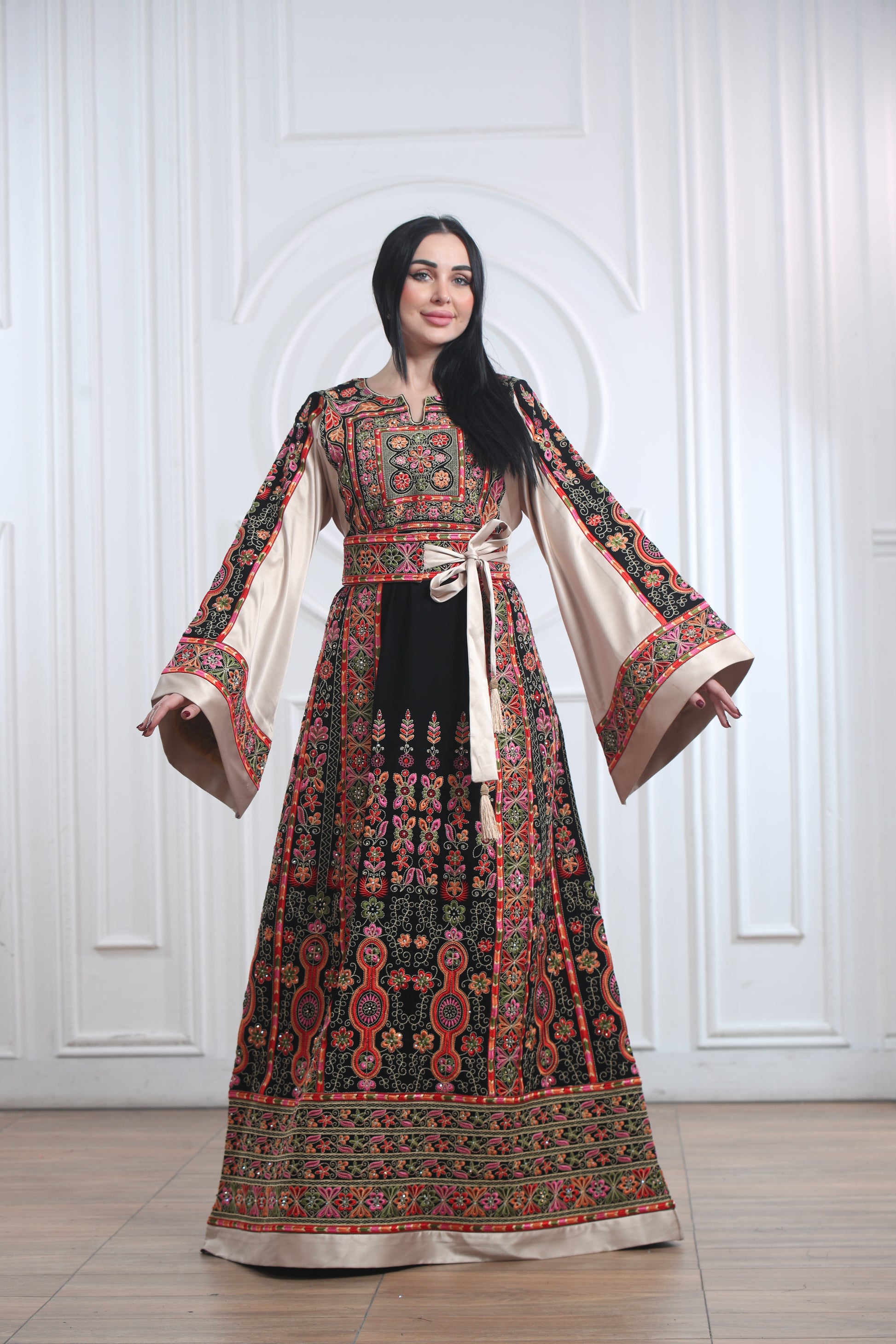 The Satin Malaka Thobe features detailed patterned designs across the bodice, sleeves, and hemline, creating a look that blends elegance with artistry. Crafted from smooth satin, it offers a soft and refined feel with a comfortable inner lining. The wide bell sleeves and adjustable waist tie enhance its graceful flow.