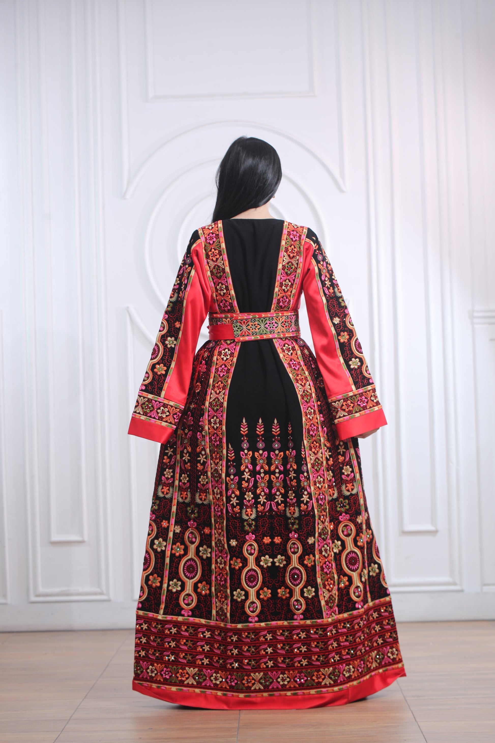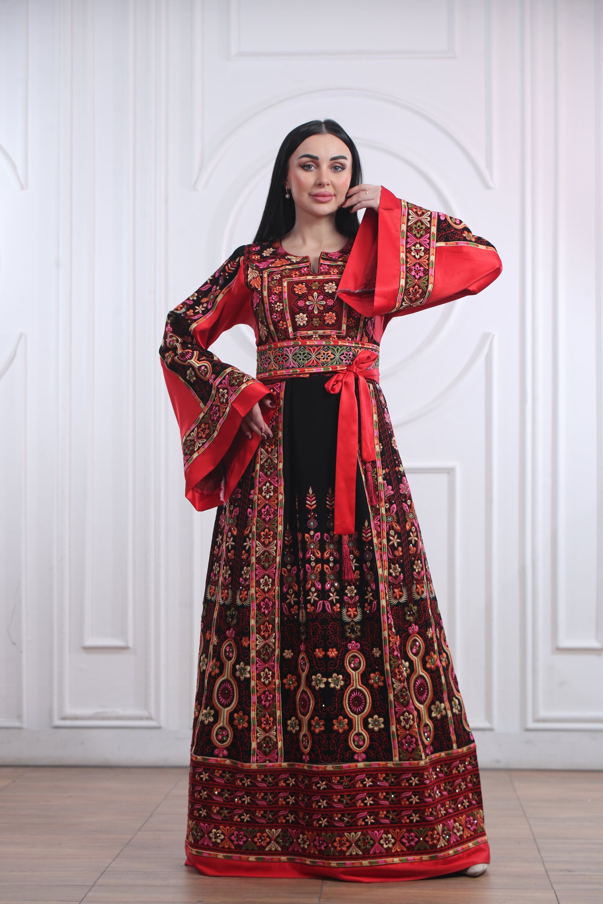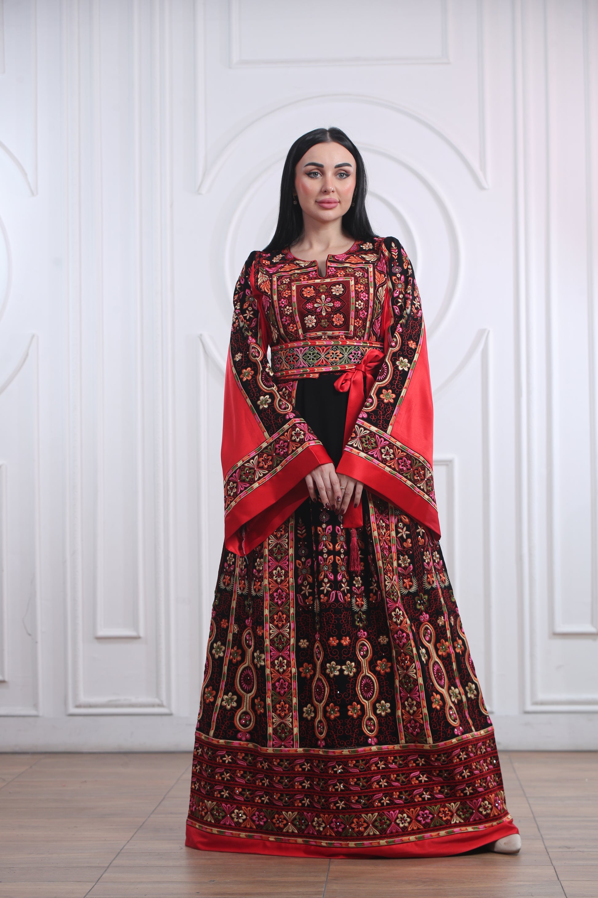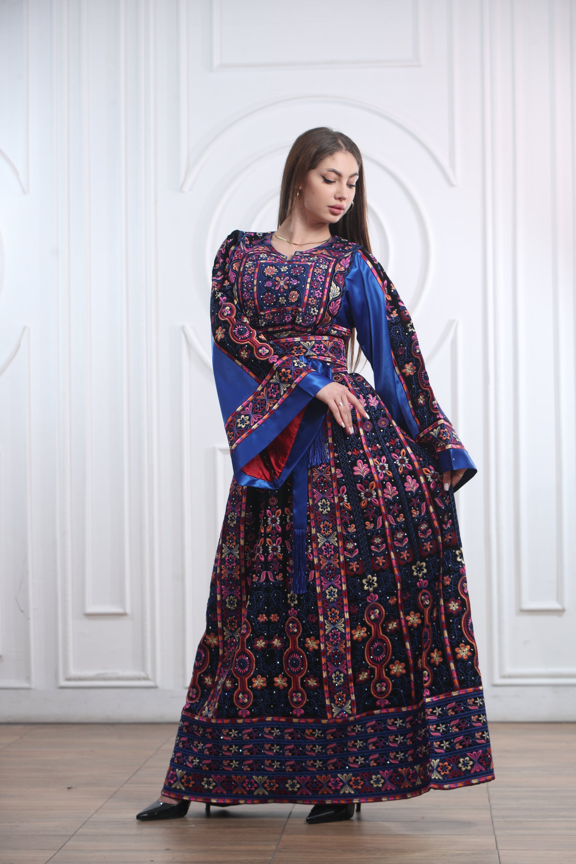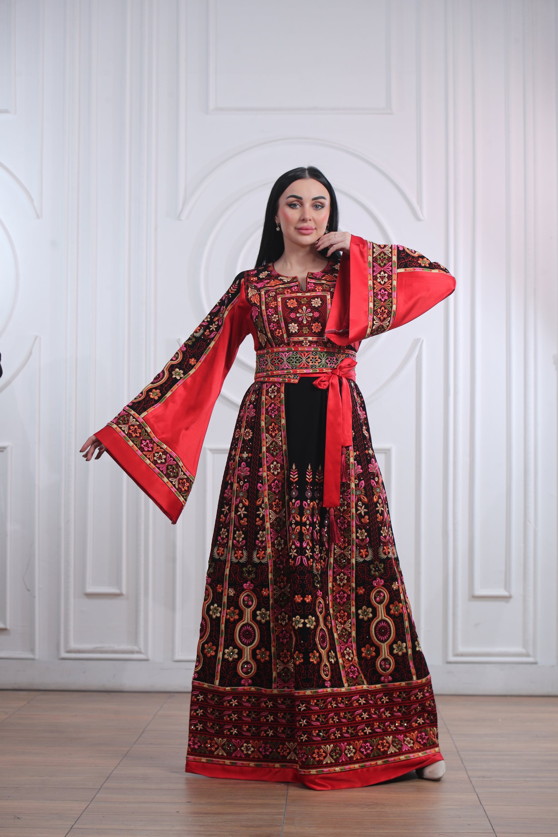The Satin Malaka Thobe features detailed patterned designs across the bodice, sleeves, and hemline, creating a look that blends elegance with artistry. Crafted from smooth satin, it offers a soft and refined feel with a comfortable inner lining. The wide bell sleeves and adjustable waist tie enhance its graceful flow.
