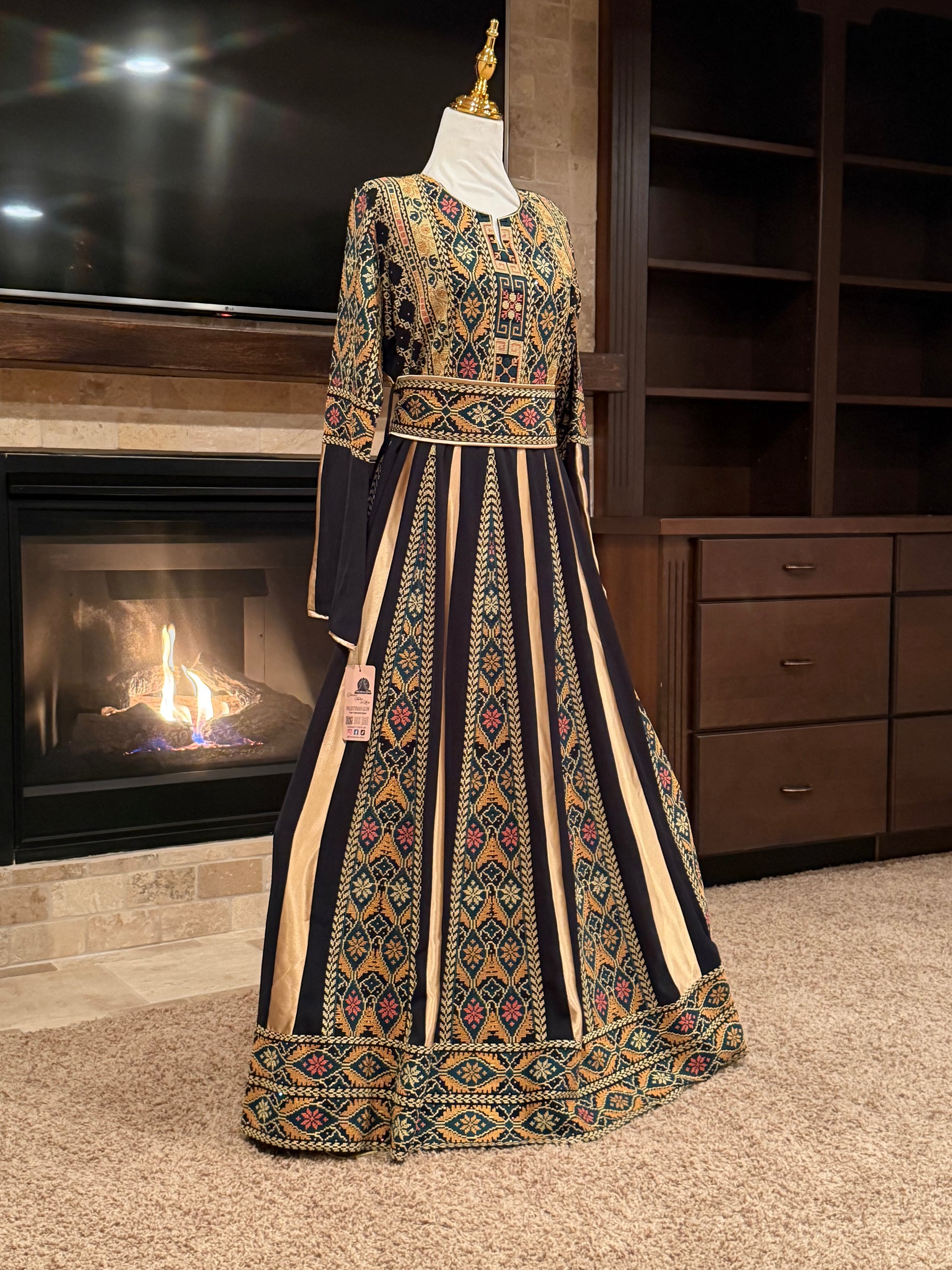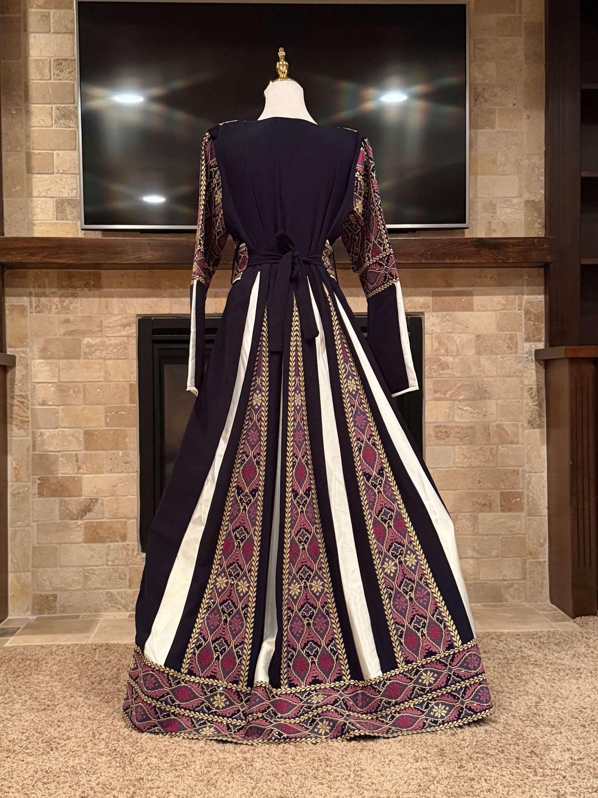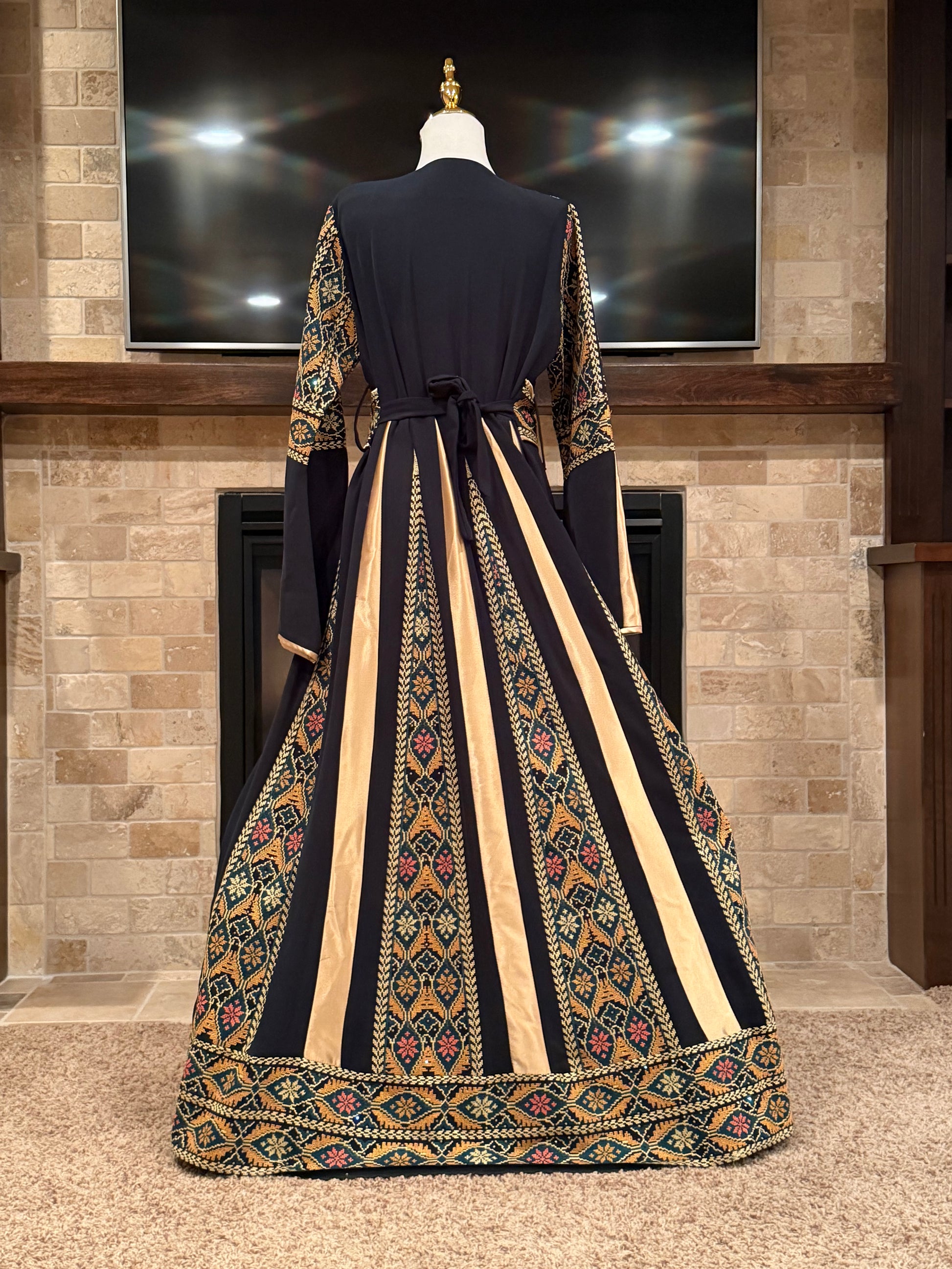 Al Sharkasi Thobe exudes timeless sophistication with its lustrous satin finish and detailed embroidery. The flowing silhouette and structured waist create a graceful balance of elegance and strength, making it ideal for special occasions. A modern interpretation of classic tradition, this piece radiates refined luxury.