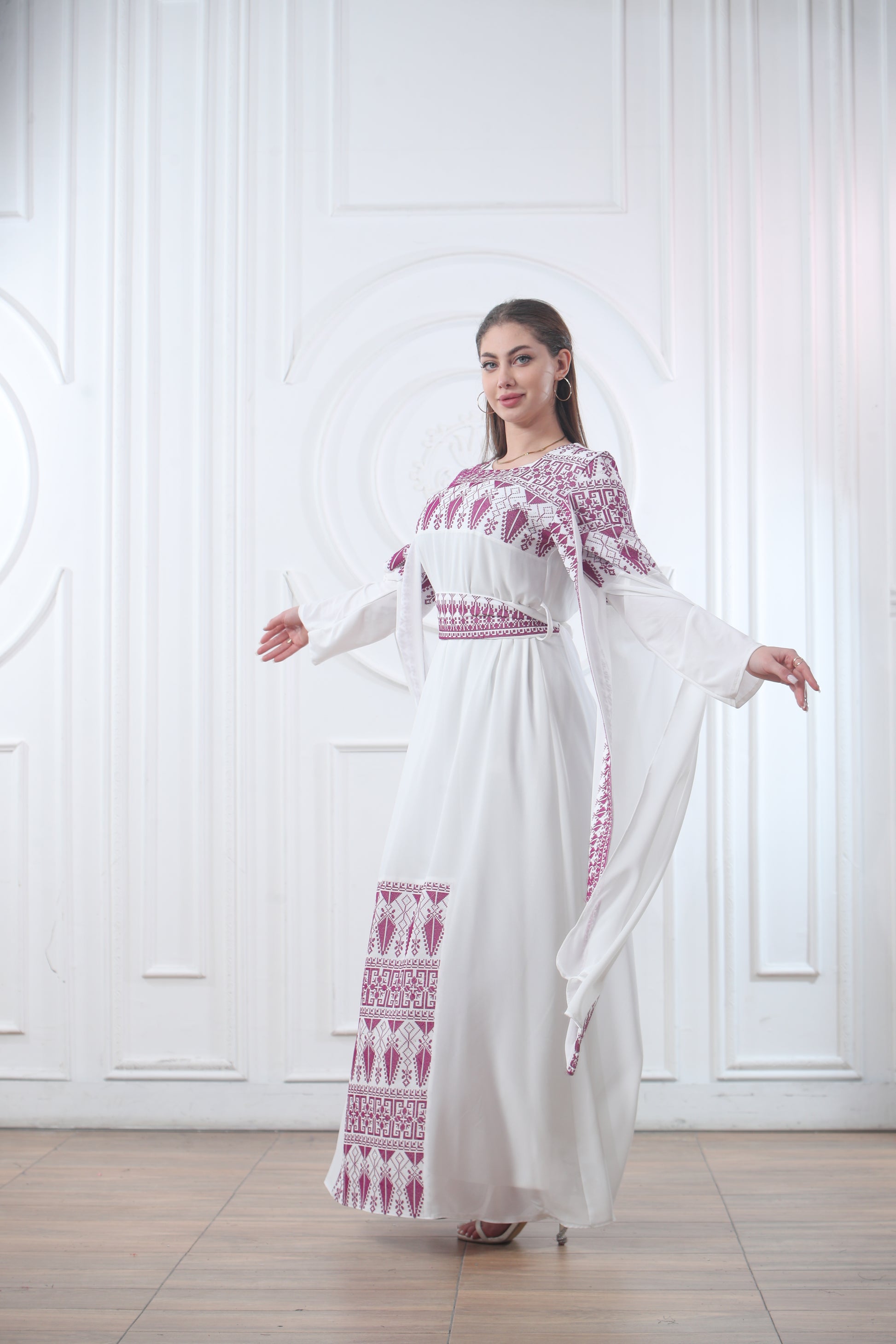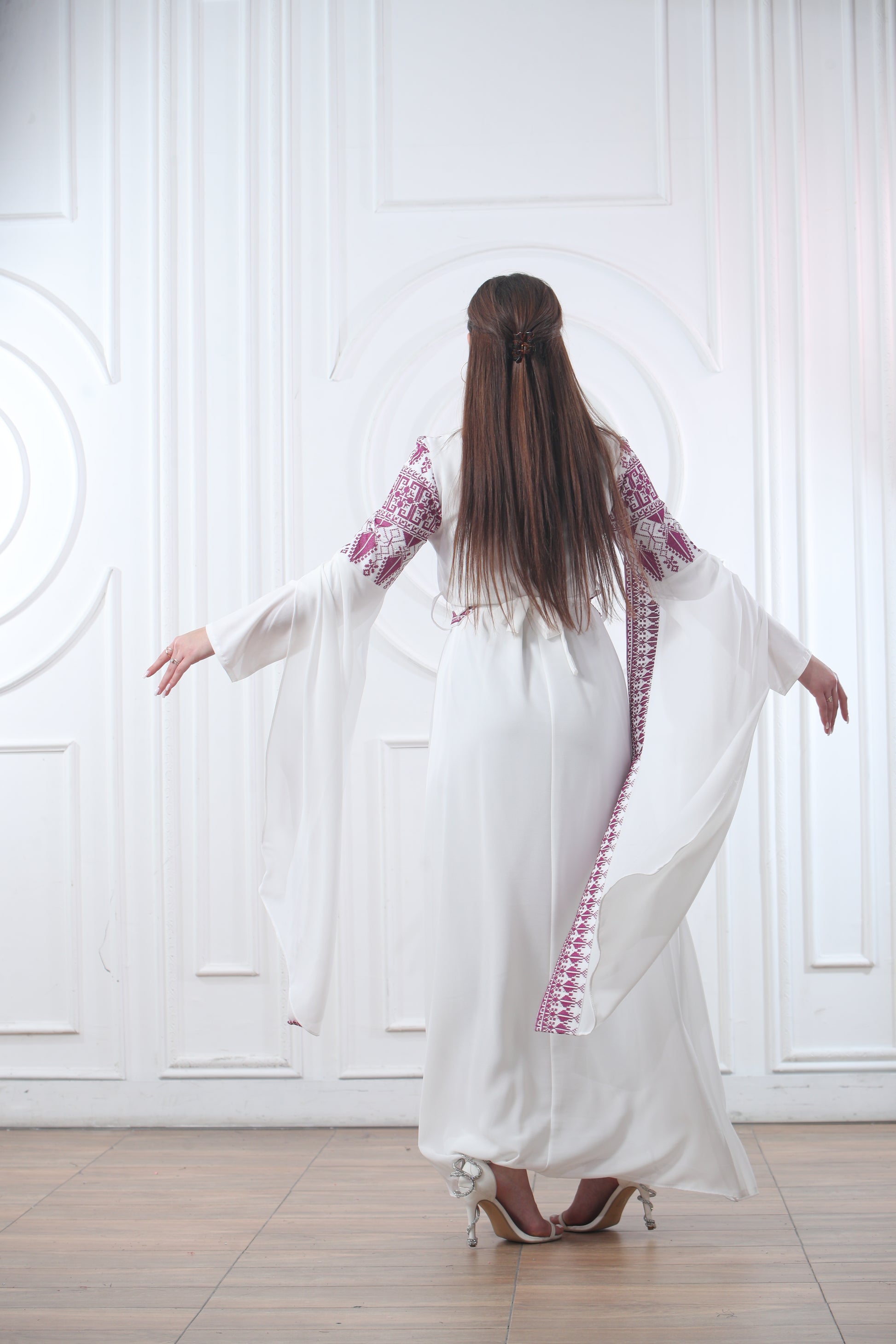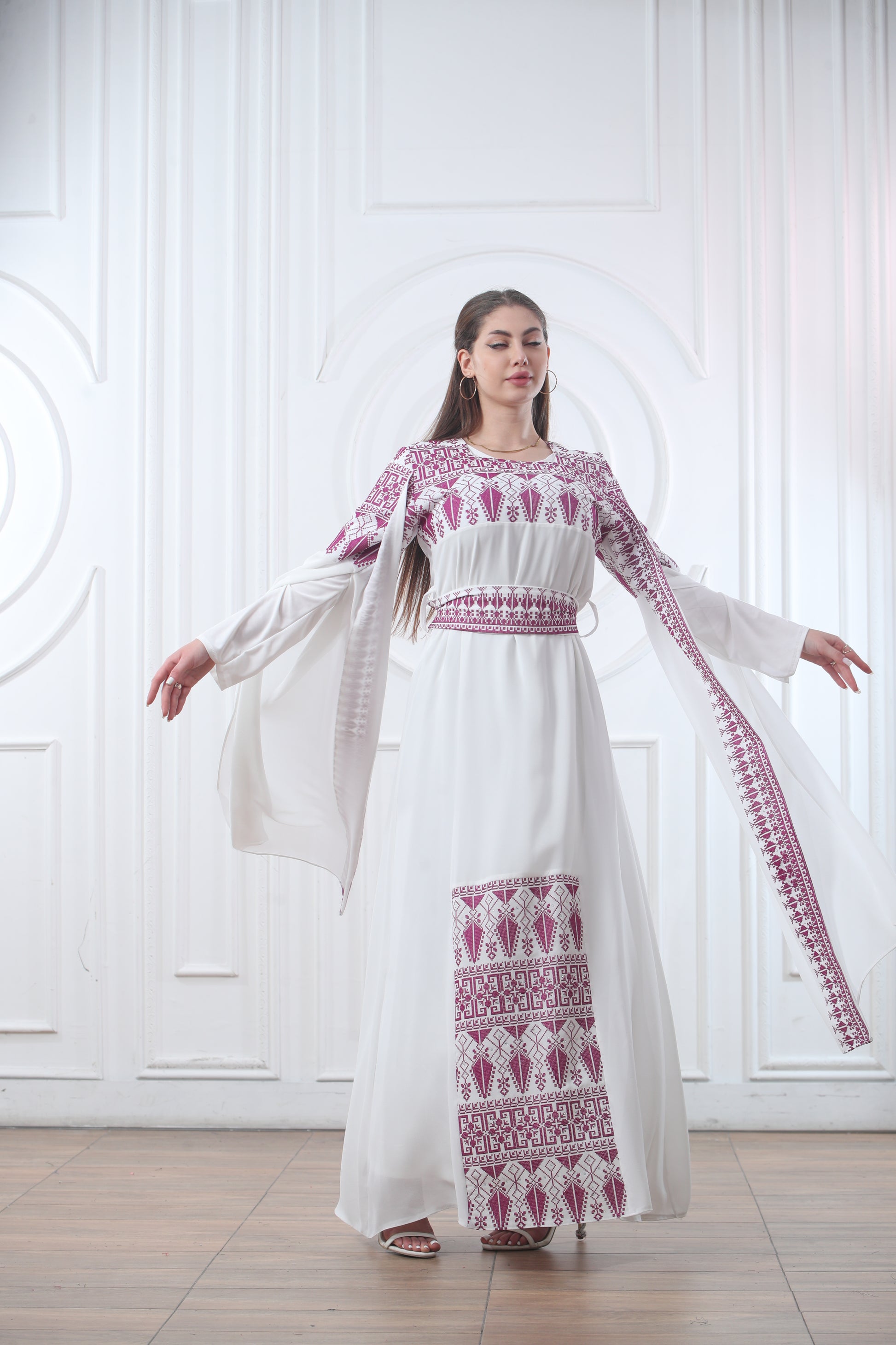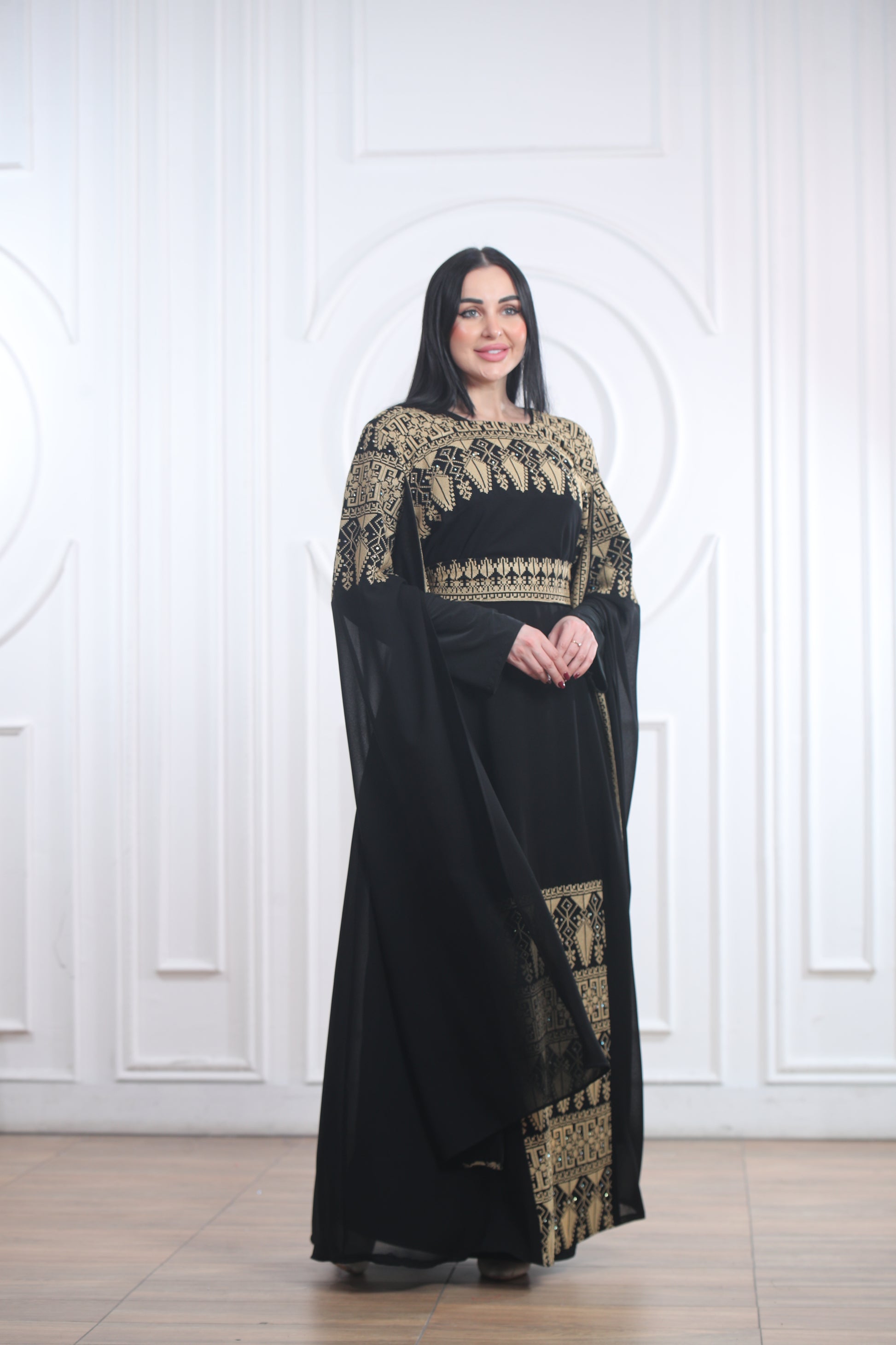 The Sultana Thobe reflects elegance and tradition with its detailed embroidery and flowing design. The draped sleeves and defined waist create a graceful, refined look perfect for special occasions. This piece blends heritage with timeless style, offering a sophisticated and regal presence.