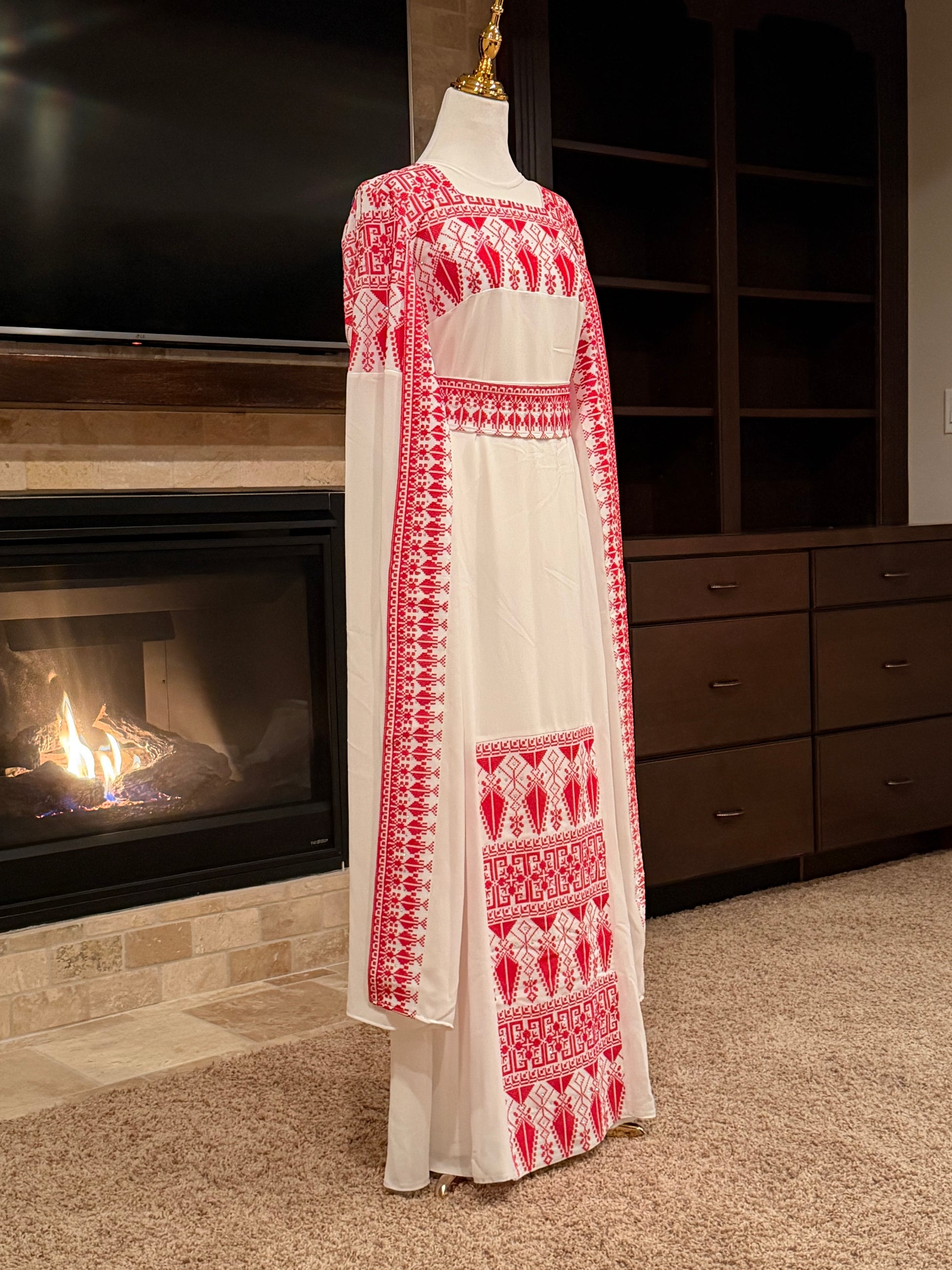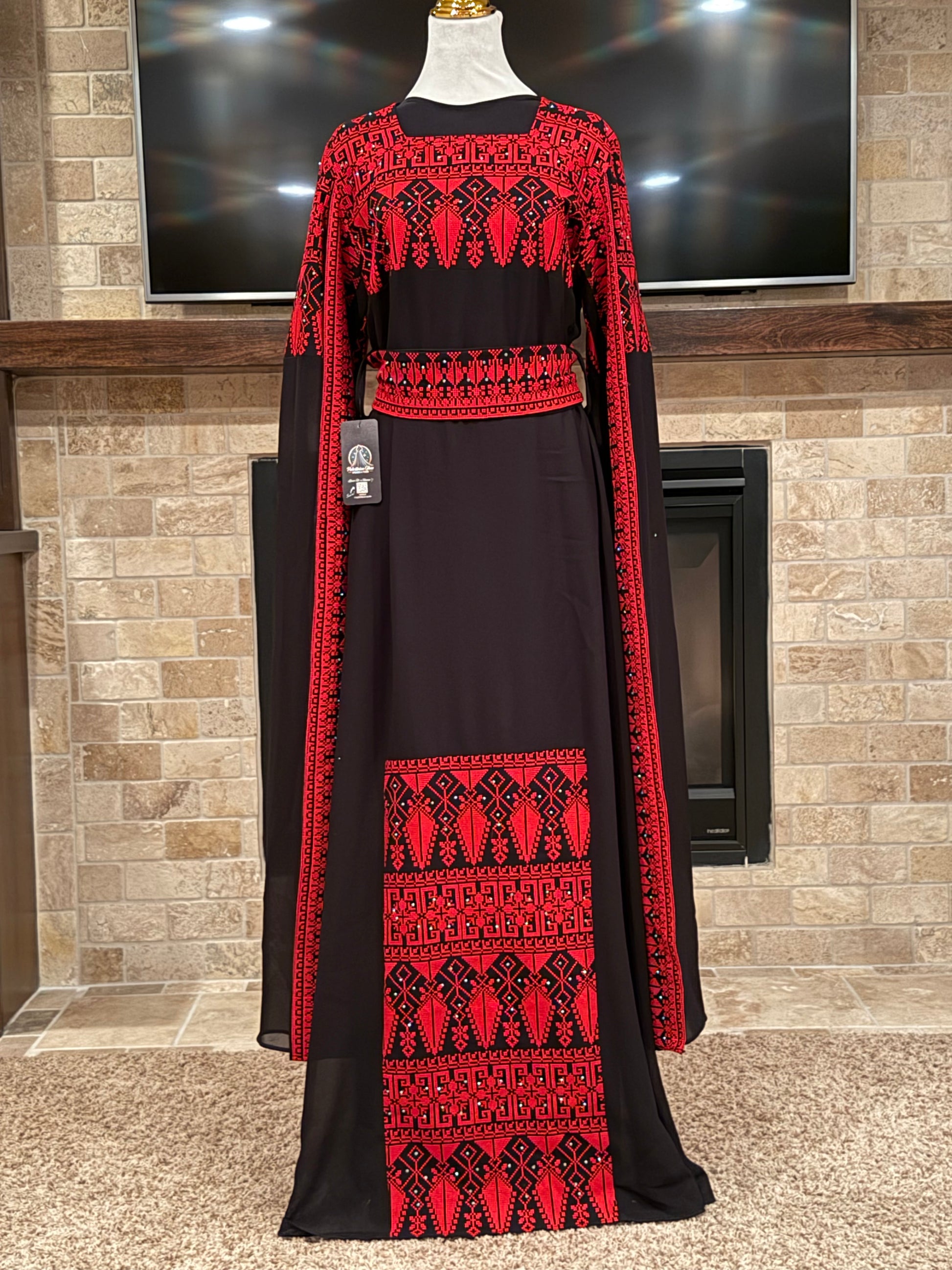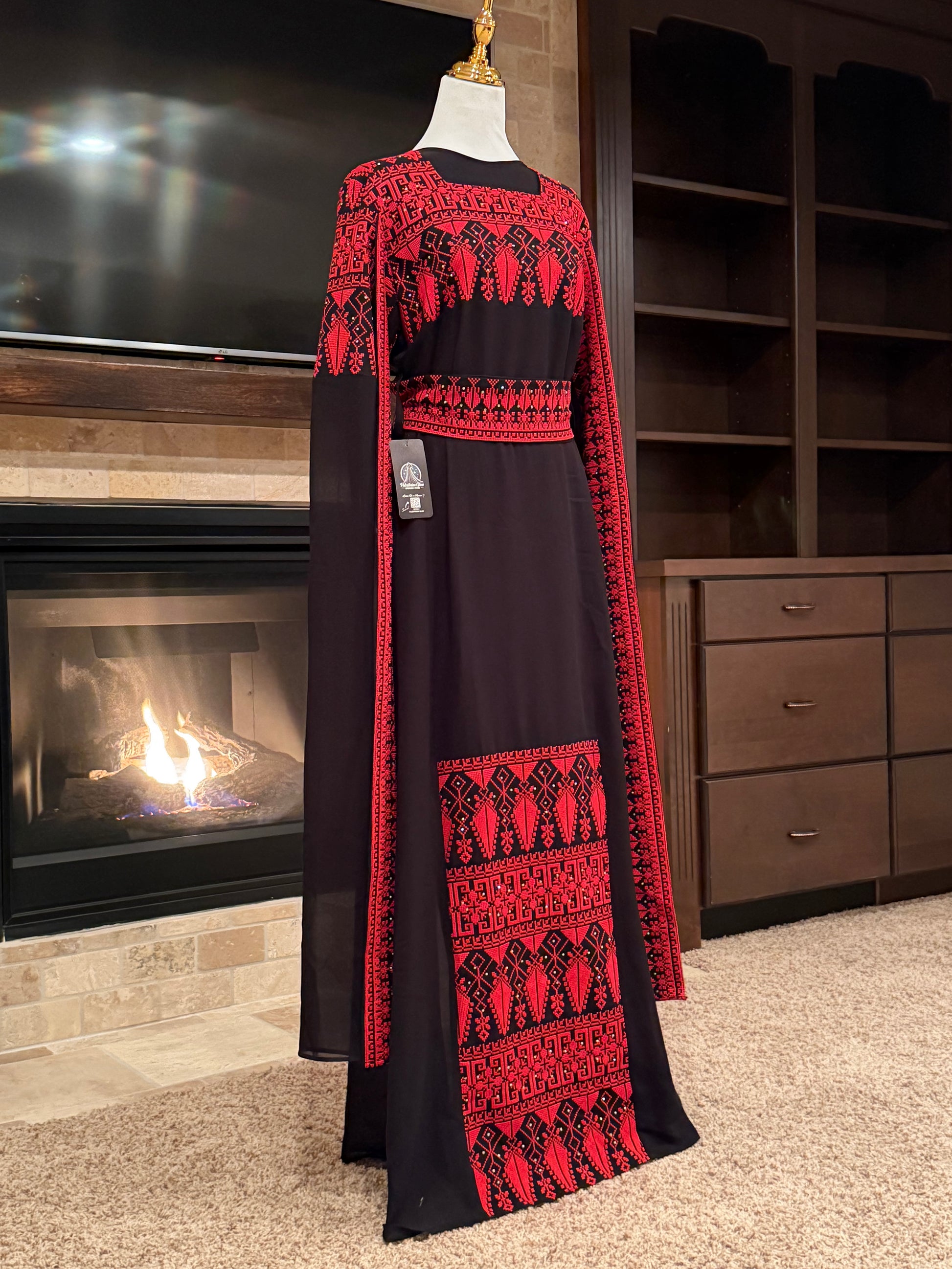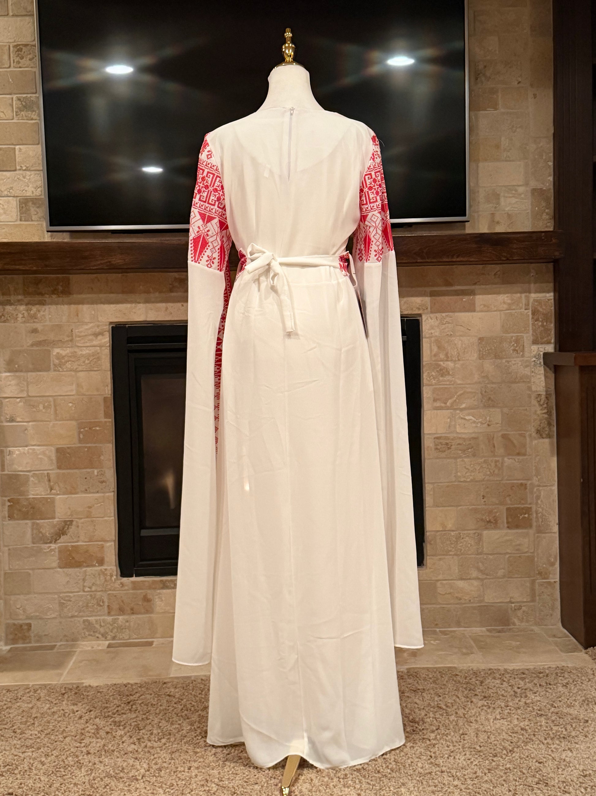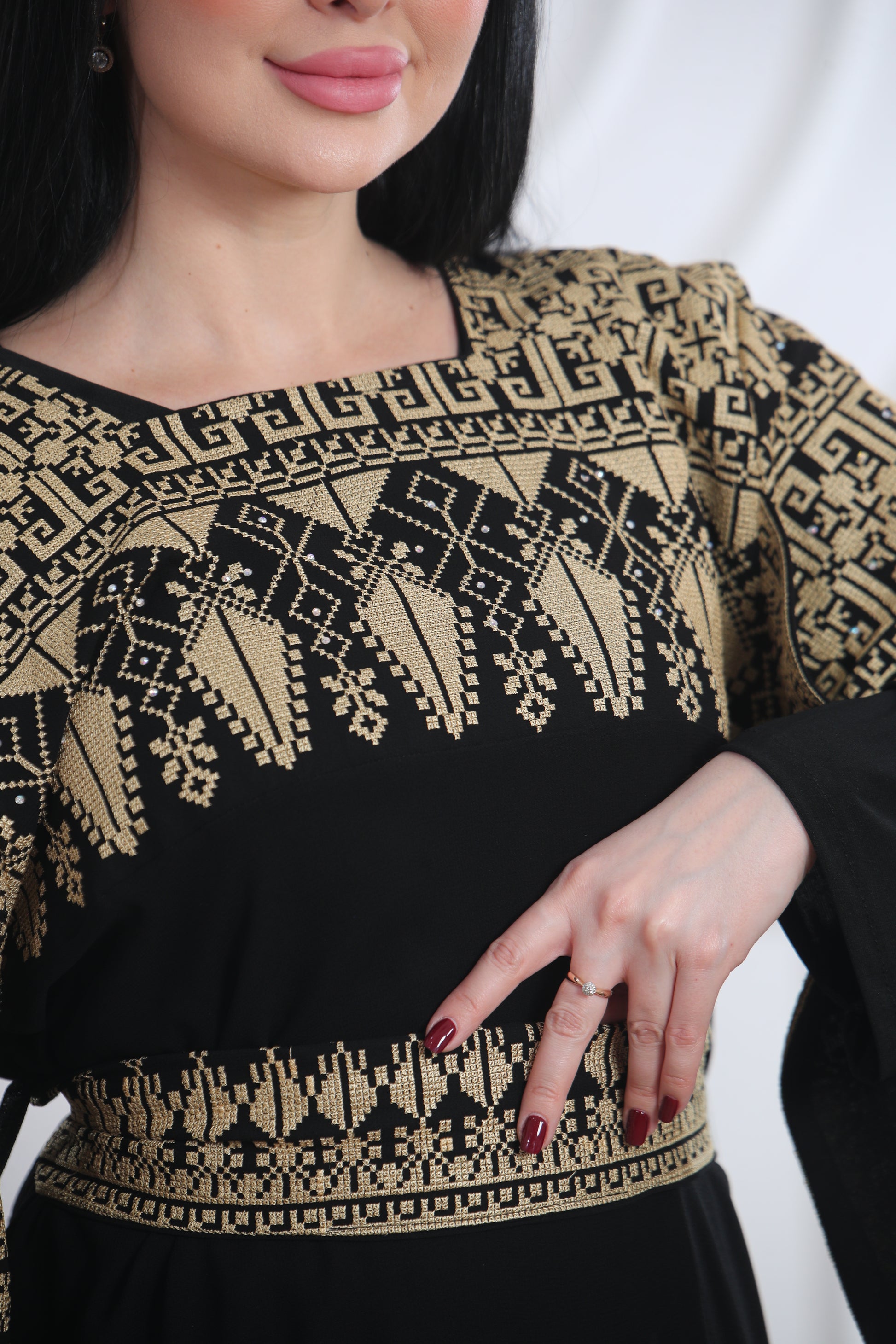 The Sultana Thobe reflects elegance and tradition with its detailed embroidery and flowing design. The draped sleeves and defined waist create a graceful, refined look perfect for special occasions. This piece blends heritage with timeless style, offering a sophisticated and regal presence.
