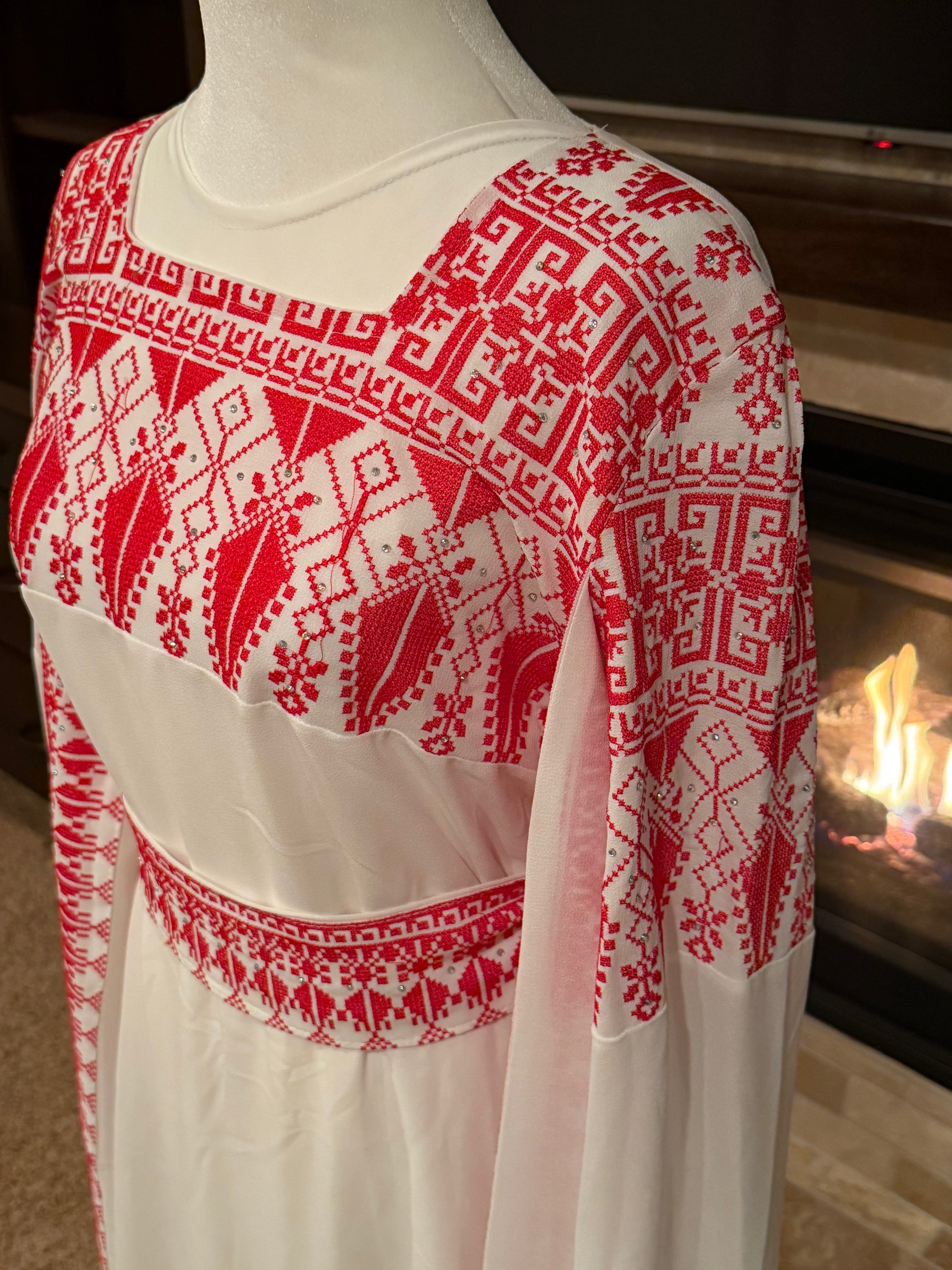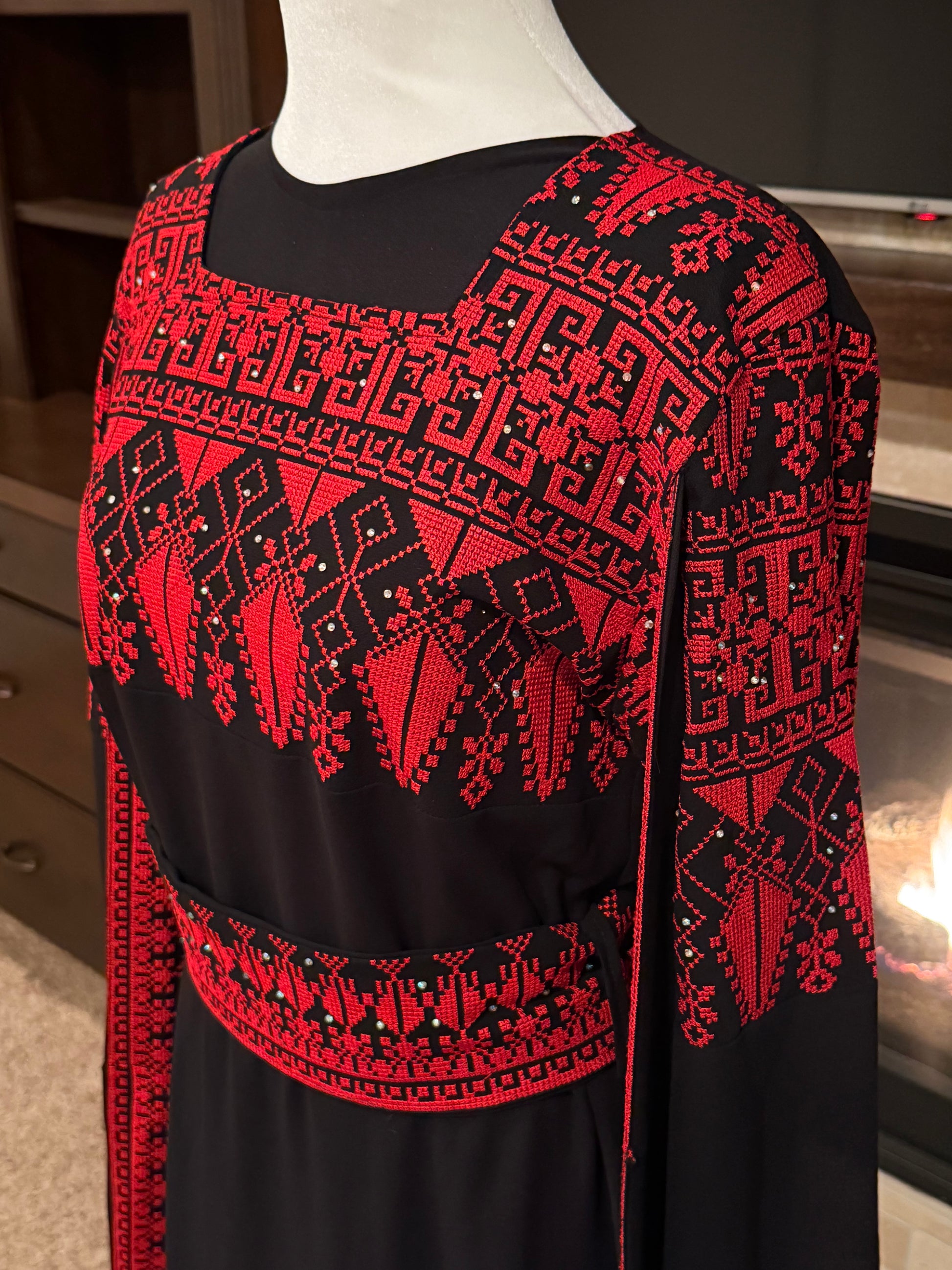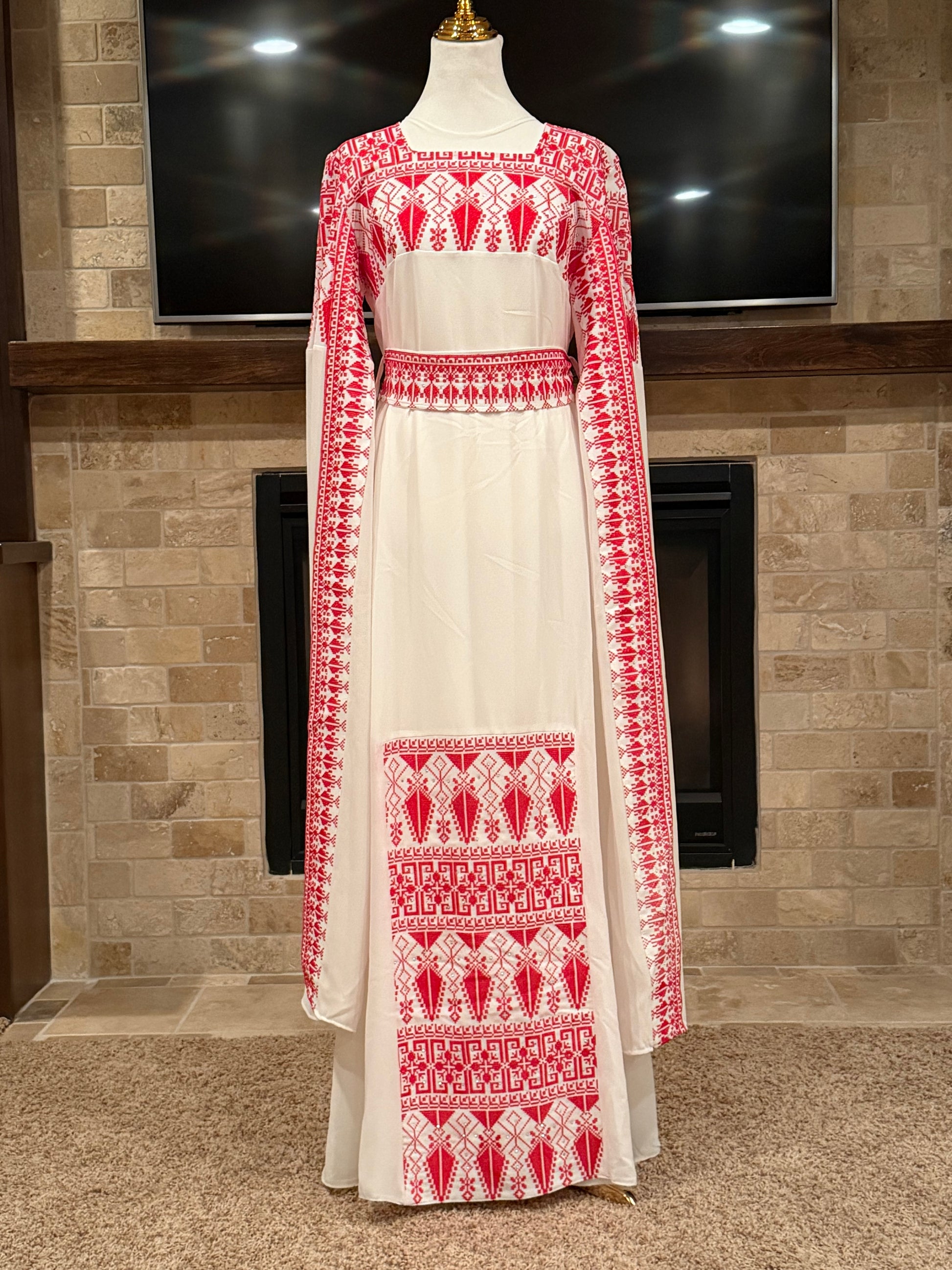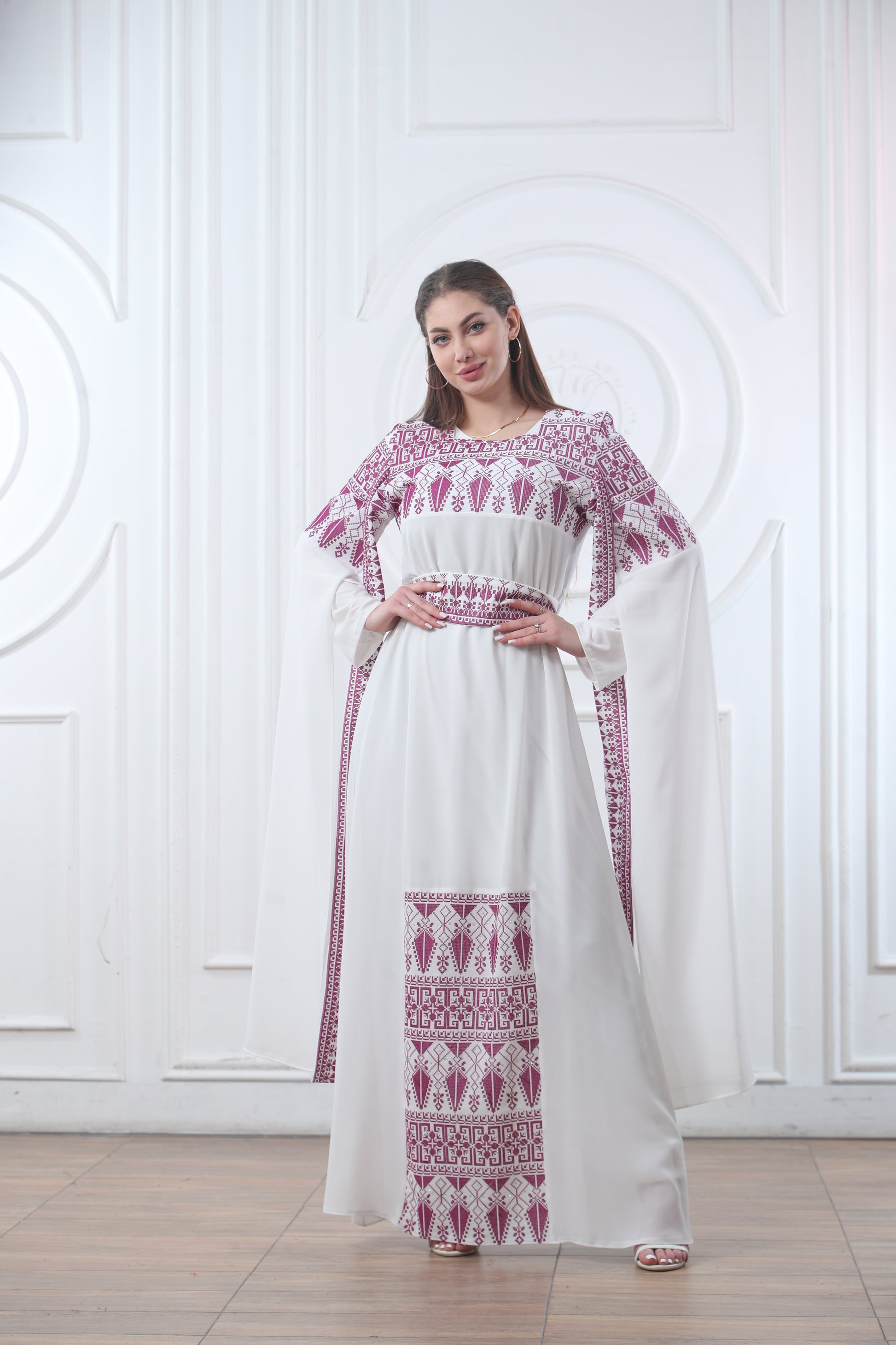 The Sultana Thobe reflects elegance and tradition with its detailed embroidery and flowing design. The draped sleeves and defined waist create a graceful, refined look perfect for special occasions. This piece blends heritage with timeless style, offering a sophisticated and regal presence.