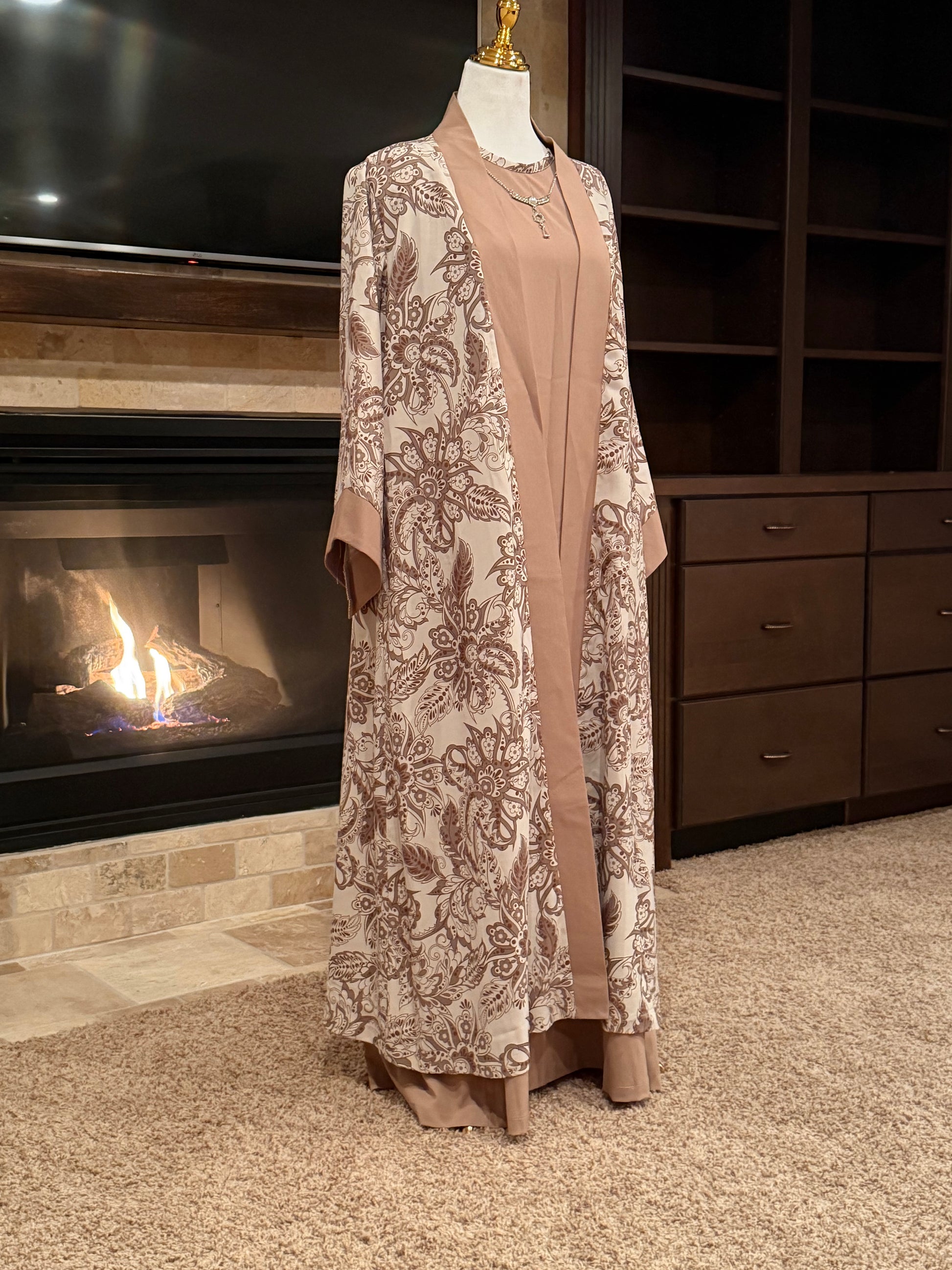 A modest and sophisticated two-piece abaya set made for effortless style. The inner dress is fully closed with a smooth, comfortable fit that provides complete coverage. The open outer layer features a soft floral pattern that brings a touch of elegance and flow to the look.